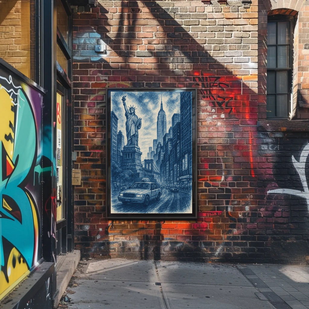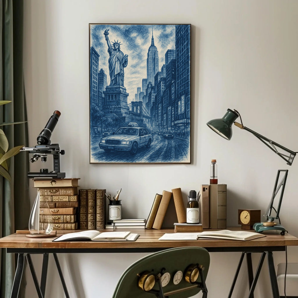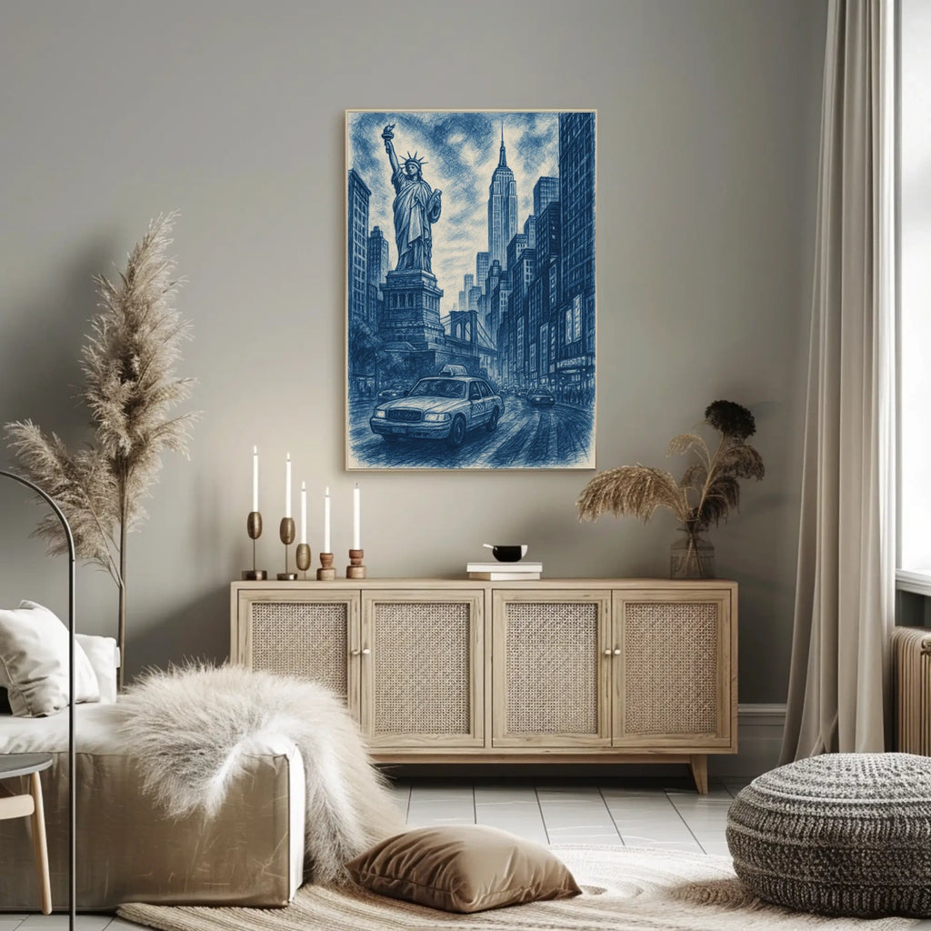 Immerse yourself in the vibrant energy of New York City with City of Dreams, a stunning artistic depiction that blends iconic landmarks into a luminous urban panorama. This piece captures the timeless allure of the city that never sleeps, featuring the Statue of Liberty, the Empire State Building, and the Brooklyn Bridge, with a classic yellow taxi weaving through the scene.