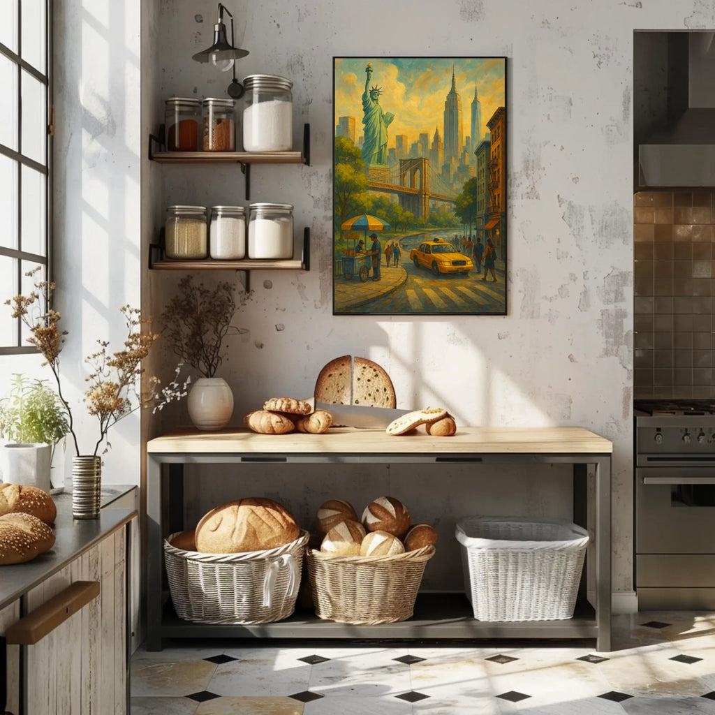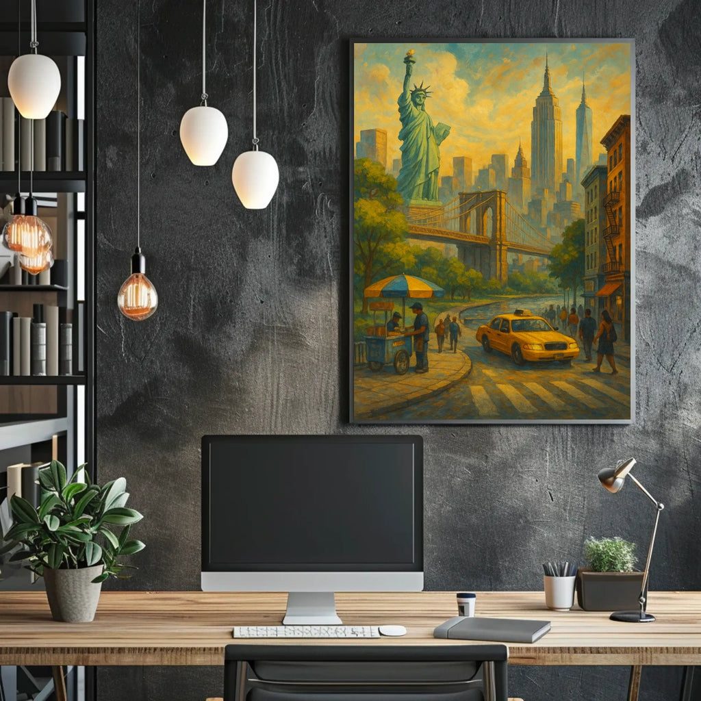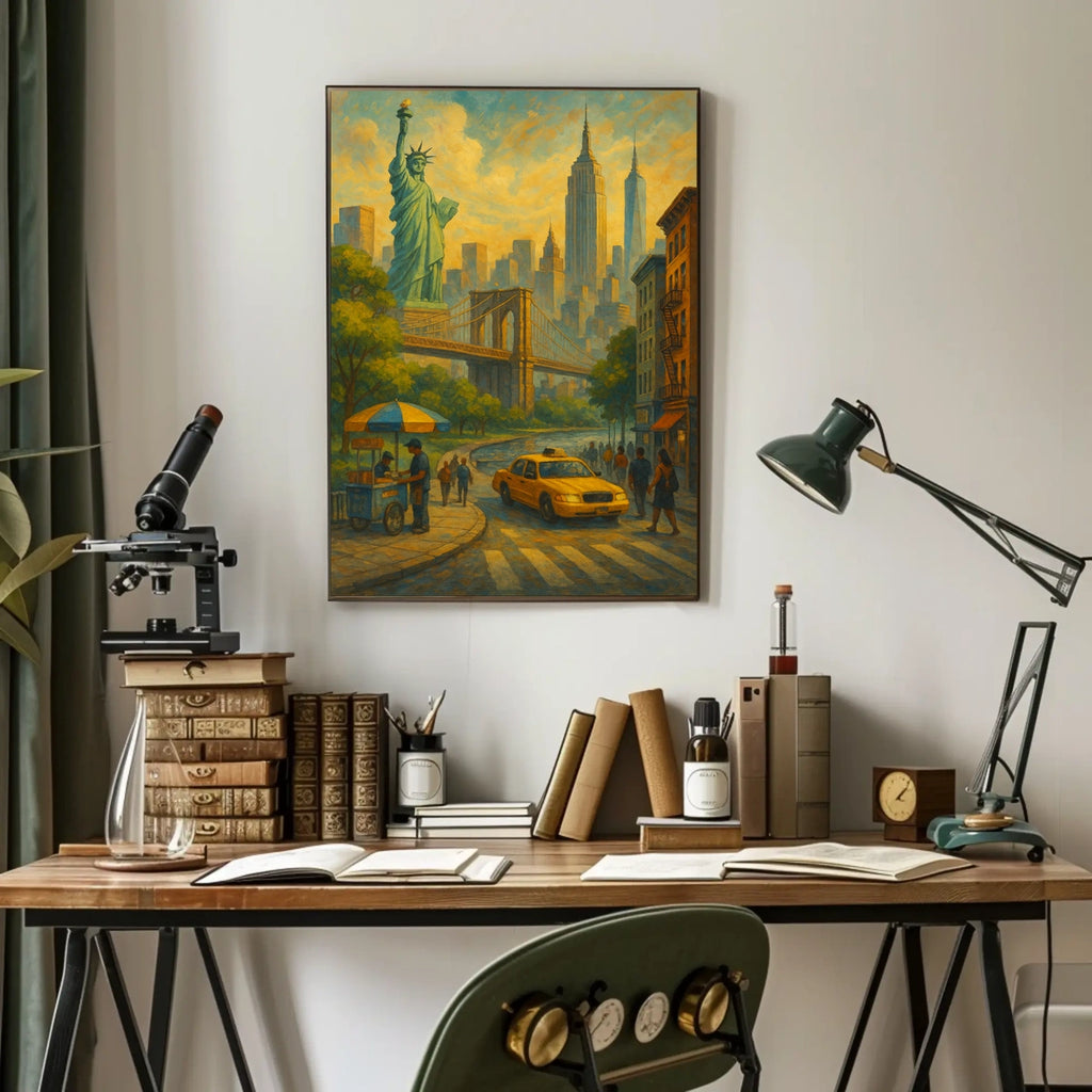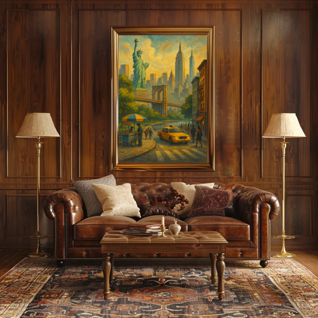 - Iconic landmarks anchor the scene with instantly recognizable symbols like the Statue of Liberty and Brooklyn Bridge, boosting familiarity and room memorability.