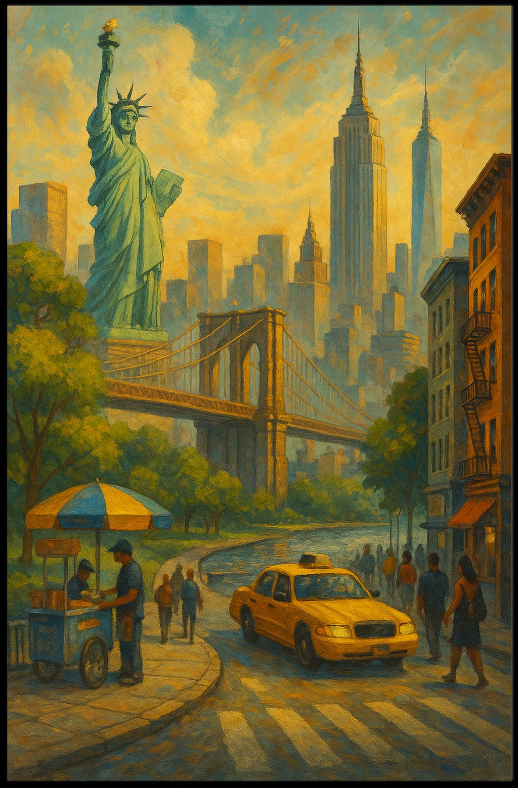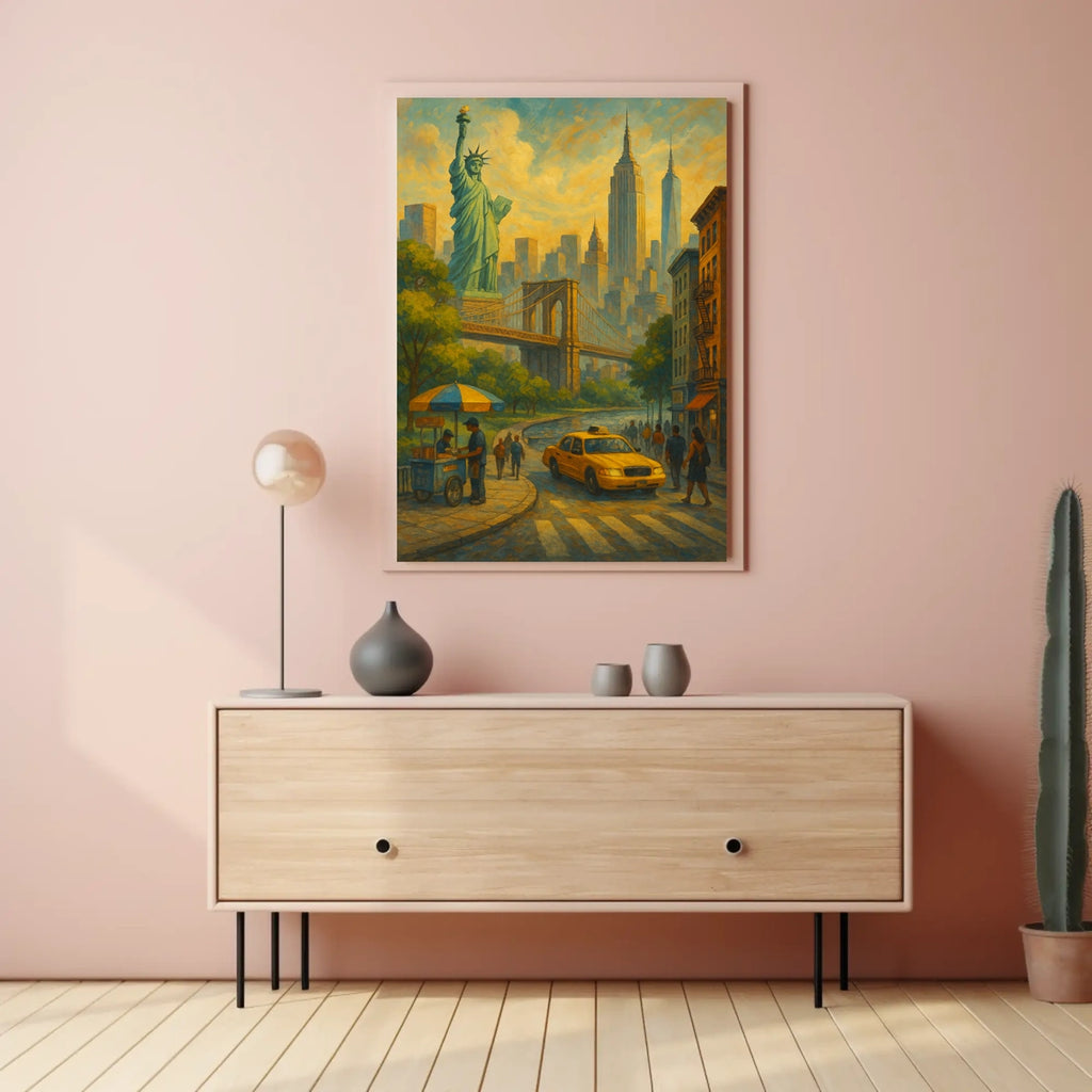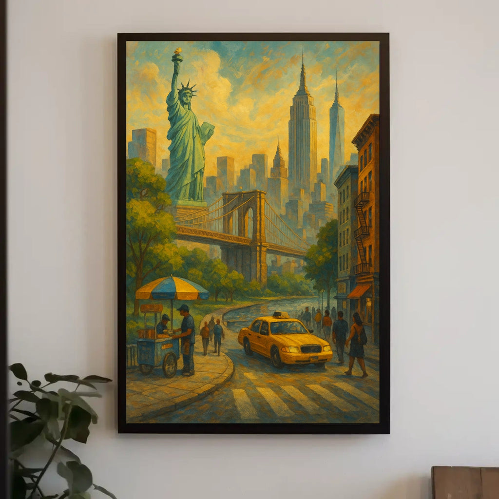 Experience the vibrant essence of New York City with City of Dreams, an artwork that captures the rush and romance of the metropolis. From the Statue of Liberty to the Brooklyn Bridge and soaring skyscrapers, this piece invites you to step into a luminous, street-level panorama. Bustling avenues, a classic yellow taxi, and a hot dog stand evoke timeless urban charm that energizes any space.