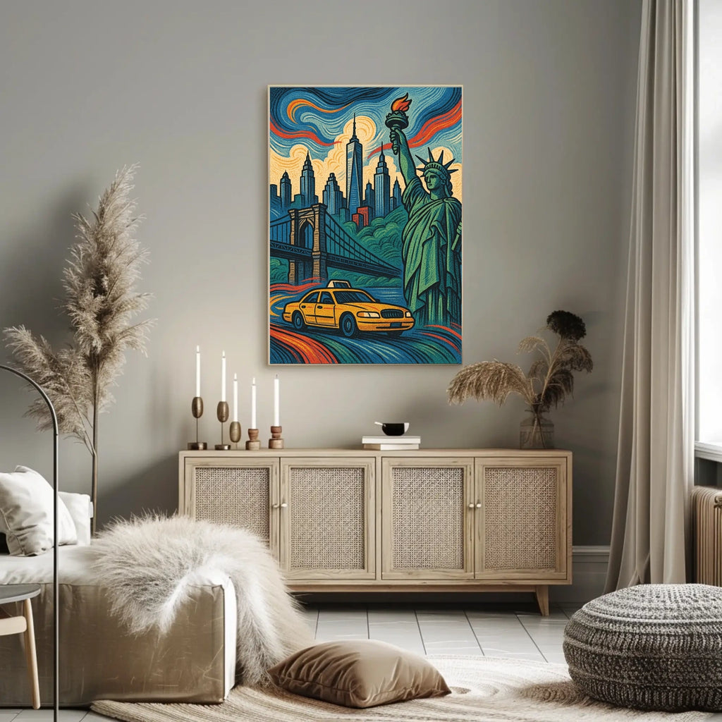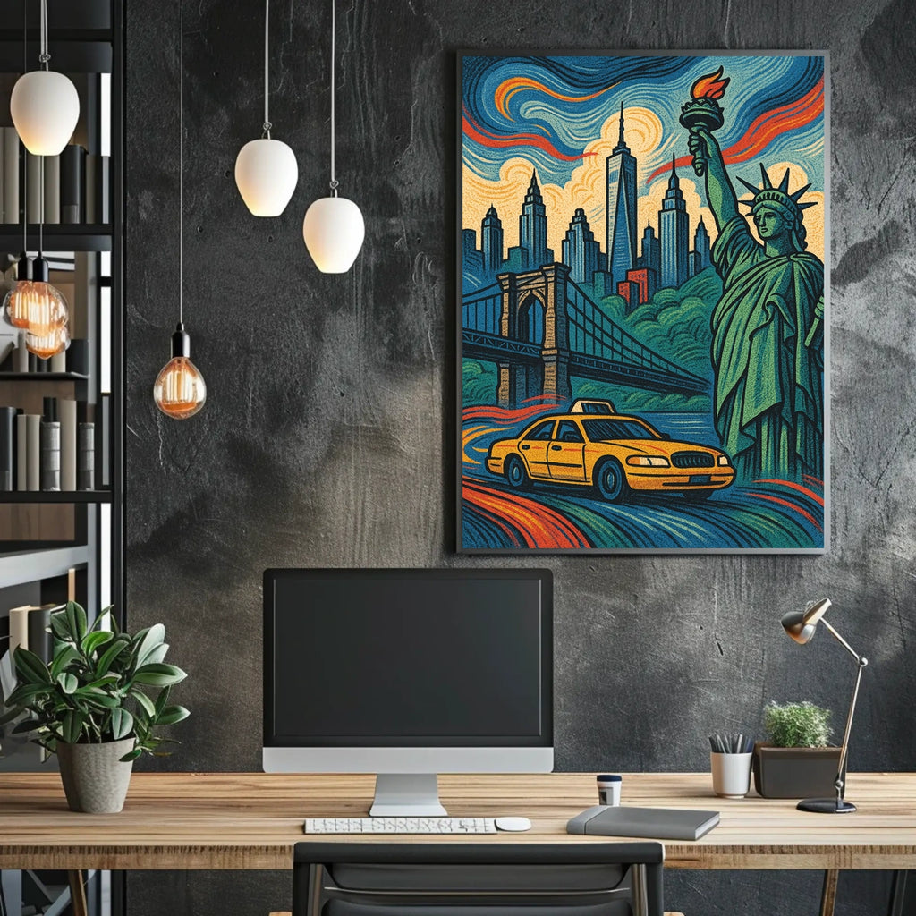 Capture the pulse of New York City with City of Dreams, a bold poster that brings the Big Apple into any room. This artwork celebrates iconic landmarks, a bustling yellow taxi, and a dramatic sky, inviting you to relive the city’s energy daily.