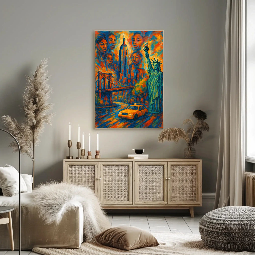 Immerse yourself in the vibrant spirit of New York City with the City of Dreams poster. This captivating artwork blends iconic landmarks—the Statue of Liberty, the Empire State Building, and the Brooklyn Bridge—with diverse faces, celebrating NYC’s multicultural identity and dynamic energy across a striking cityscape. Perfect for living rooms, offices, or creative studios seeking urban inspiration.