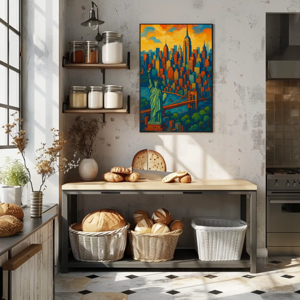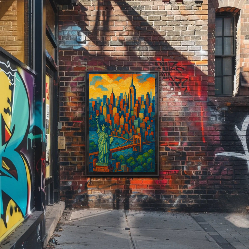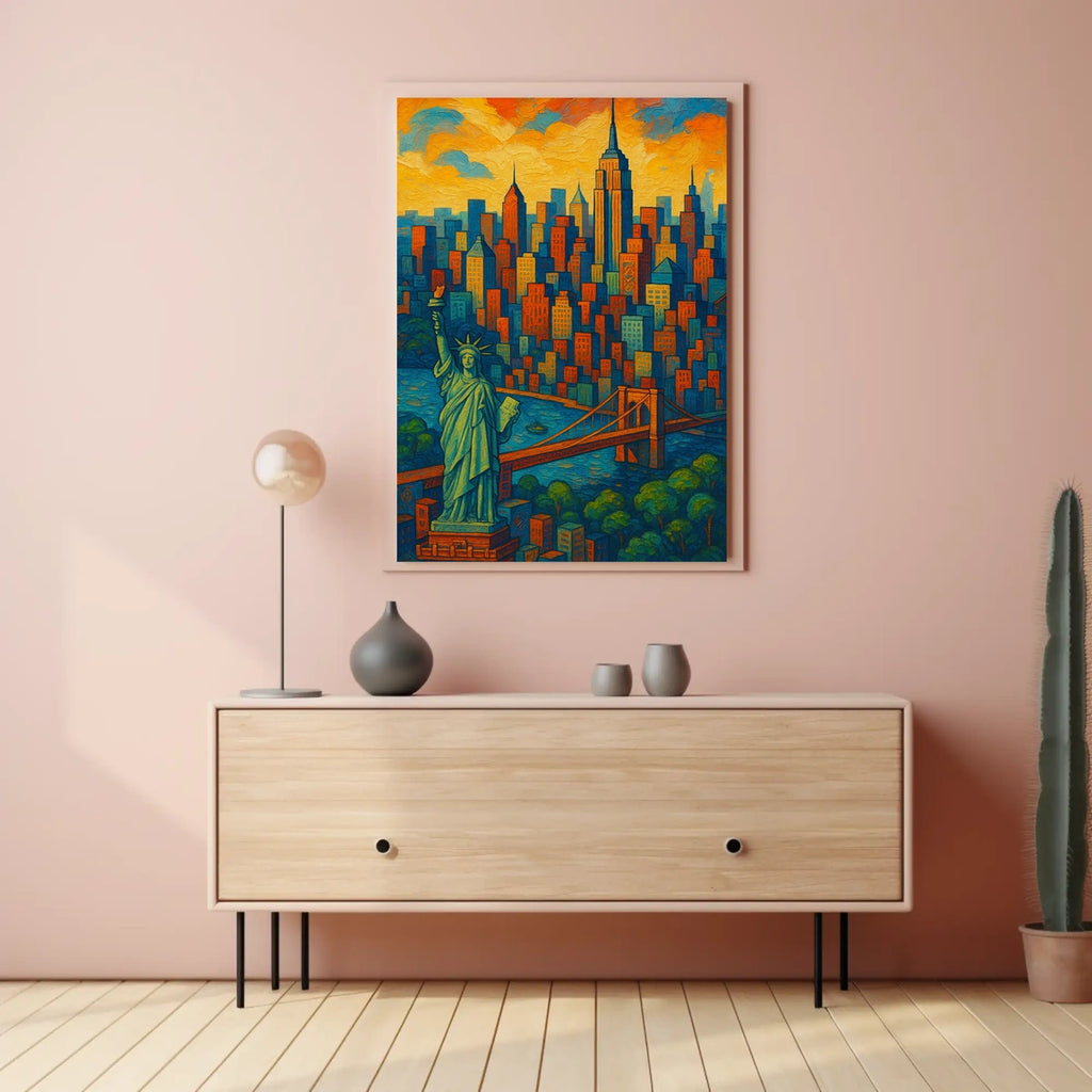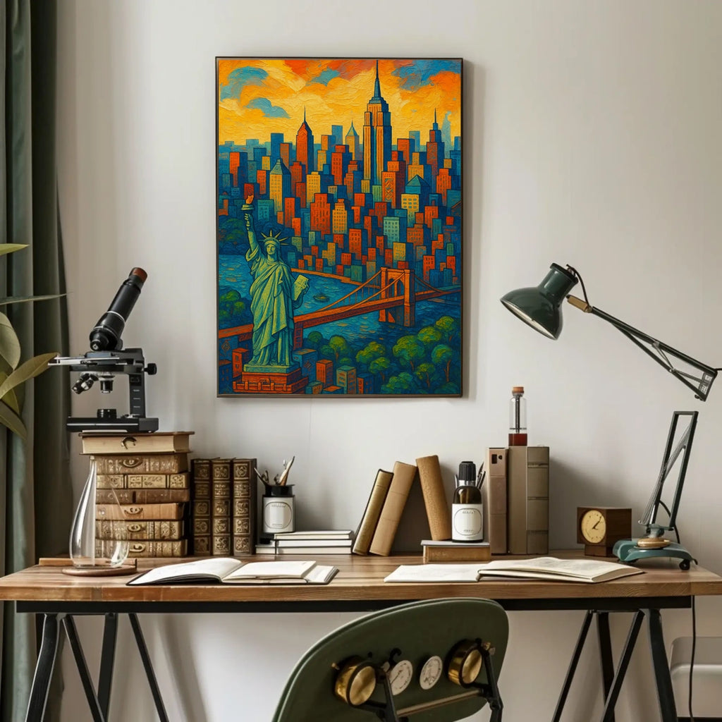 Celebrate the City of Dreams with this vibrant illustration that captures New York City's iconic skyline at sunset. The warm hues collide with crisp, cool tones to spark ambition, wonder, and bold conversations in any living space or office.