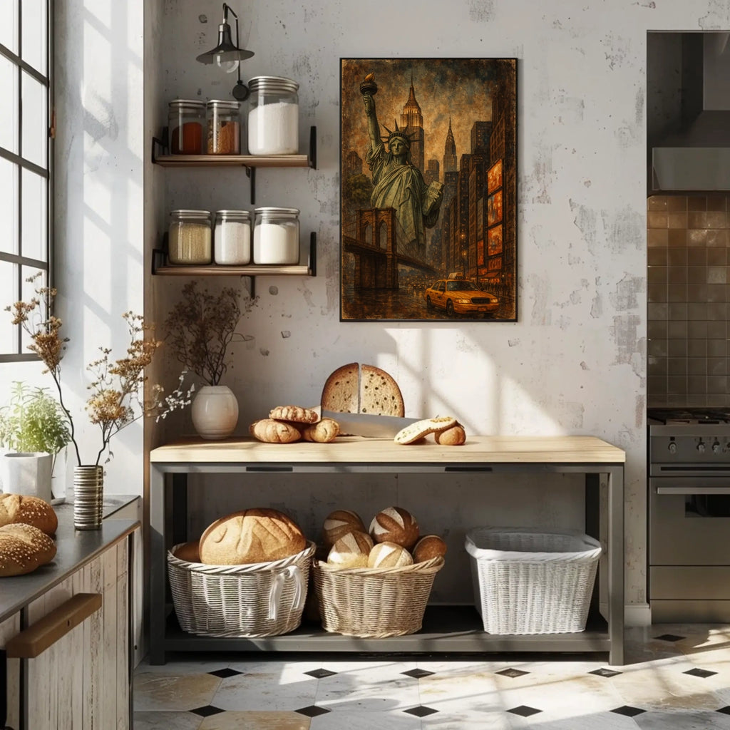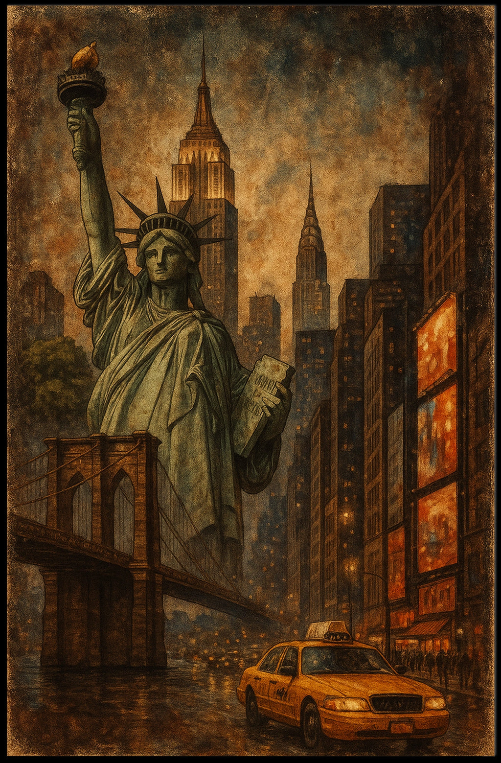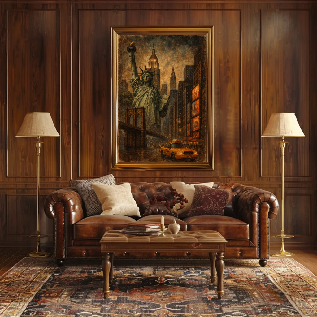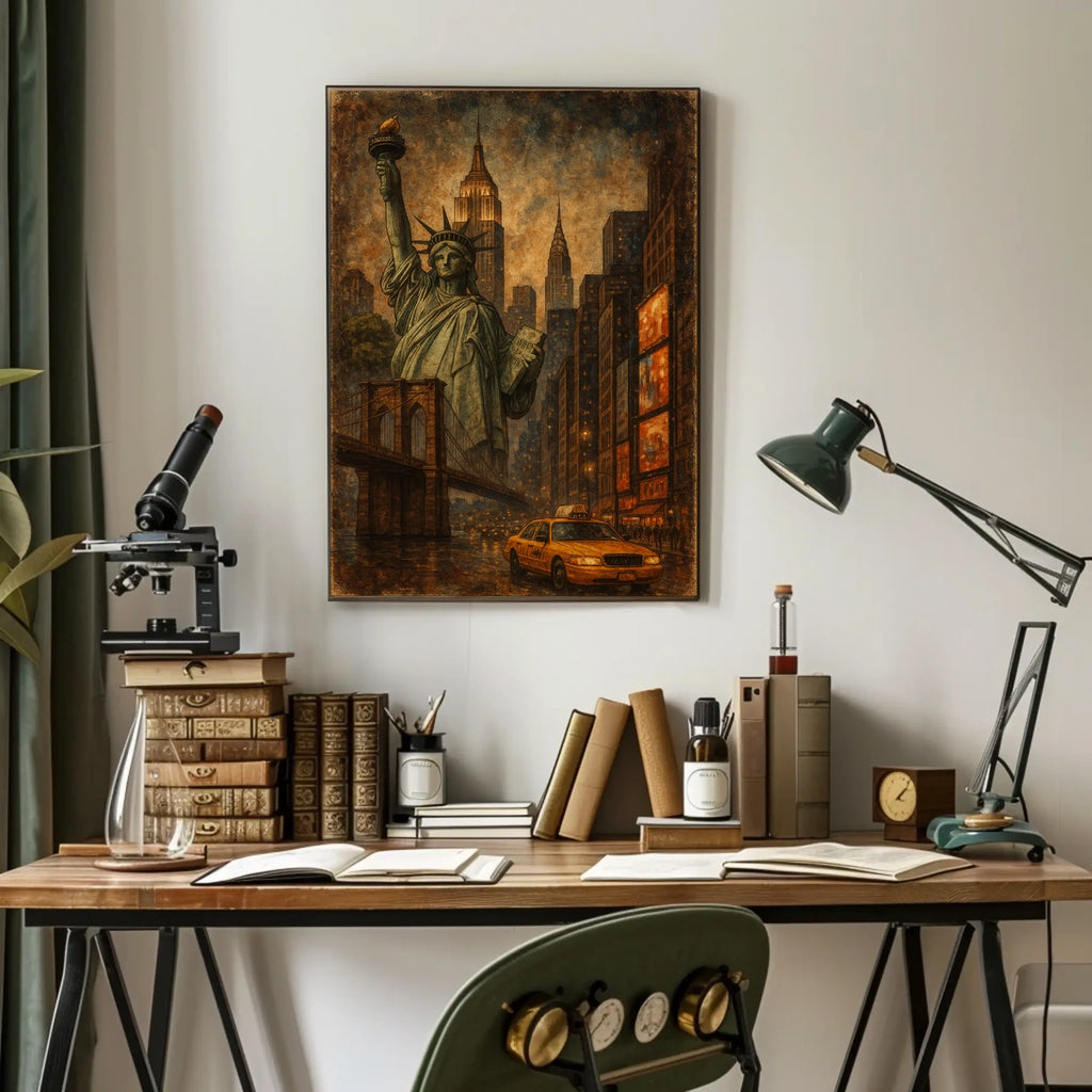 Introducing the City of Dreams Poster, a vivid nod to New York City's energy and iconic silhouettes. This evocative artwork features landmarks like the Statue of Liberty and the Brooklyn Bridge, capturing bustling streets and yellow cabs in warm vintage tones to bring timeless charm to any wall.