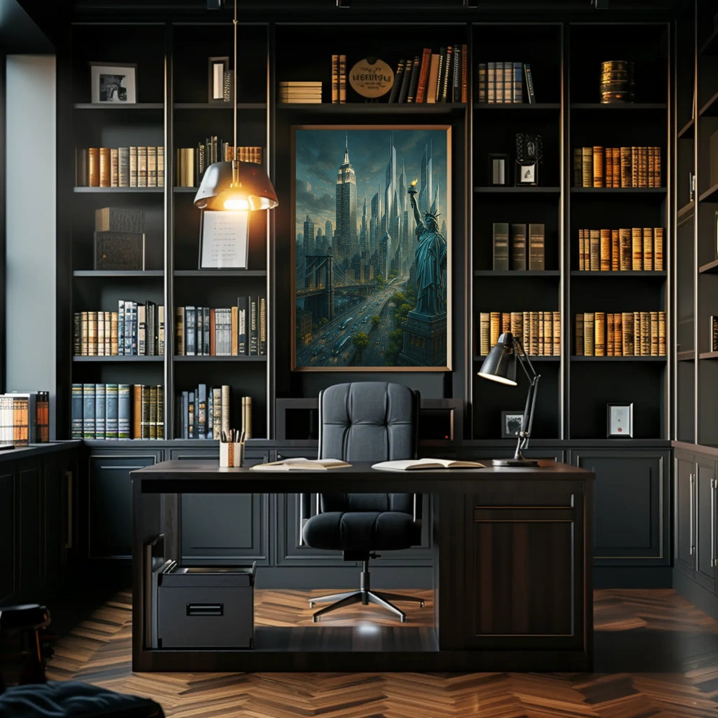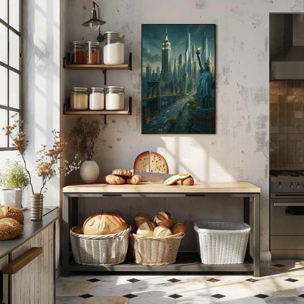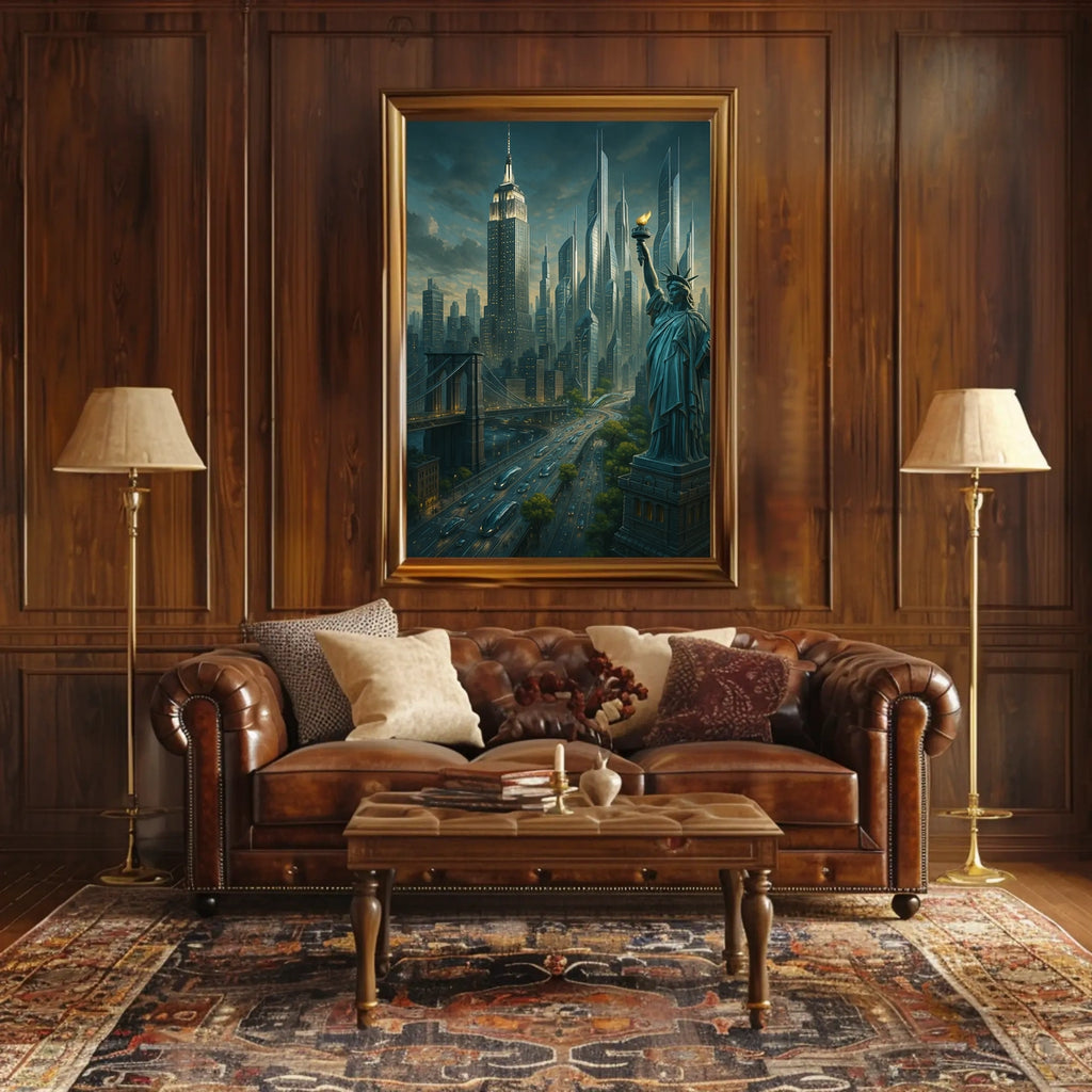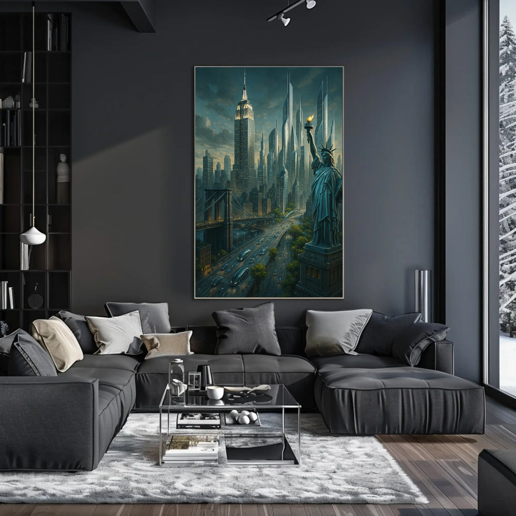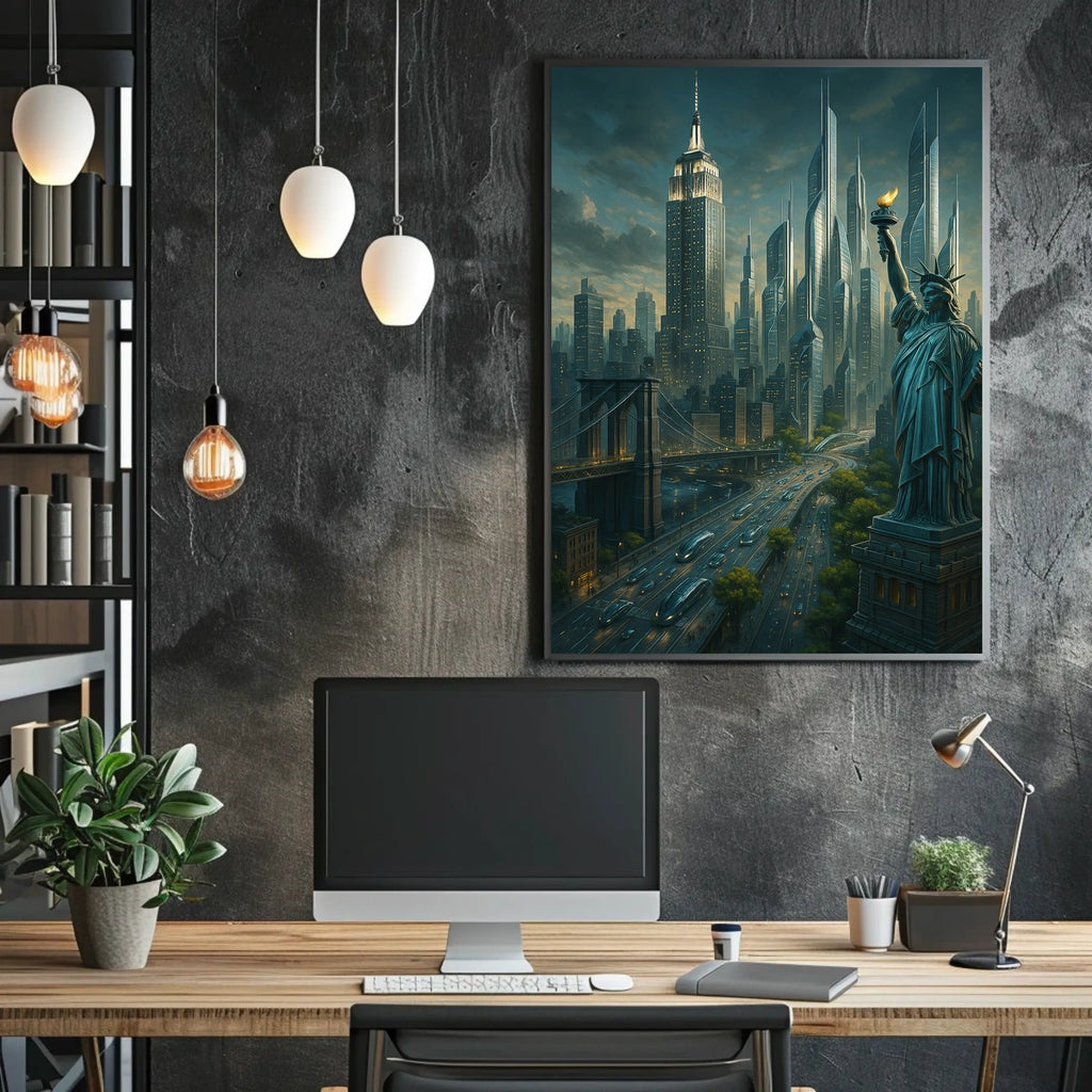 Immerse yourself in the City of Tomorrow poster, a captivating blend of tradition and innovation. This artwork reimagines a futuristic cityscape where iconic landmarks like the Statue of Liberty meet cutting-edge architecture, creating a vibrant metropolis that sparks imagination and conversation.