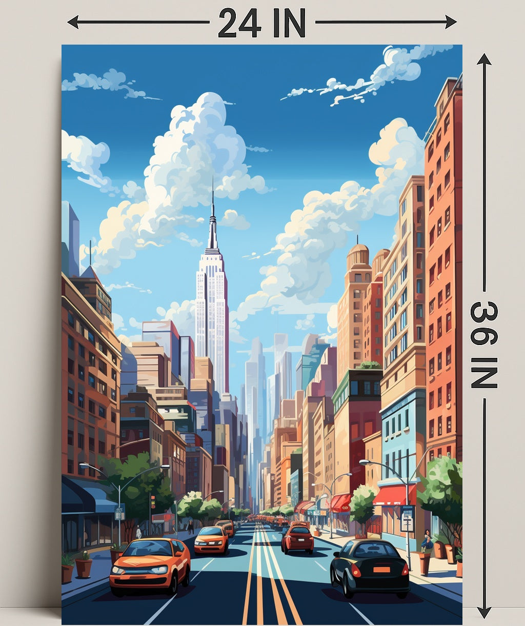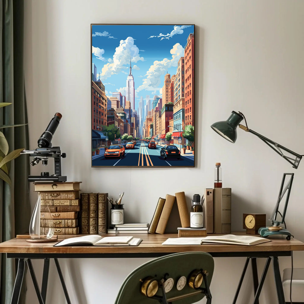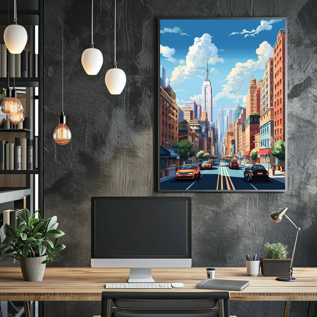 Bring the calm energy of a sunlit skyline into your home with the Cityscape Serenity Poster from PosterGoat. This striking wall art captures a peaceful urban avenue under a brilliant blue sky—towering architecture, soft billowing clouds, and warm street-level details combine in a minimalist, scenic composition that suits modern interiors and travel-inspired spaces.