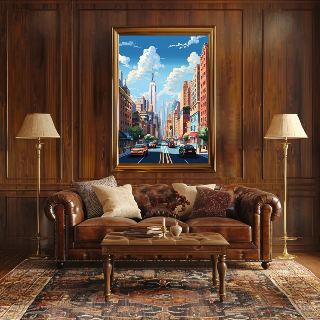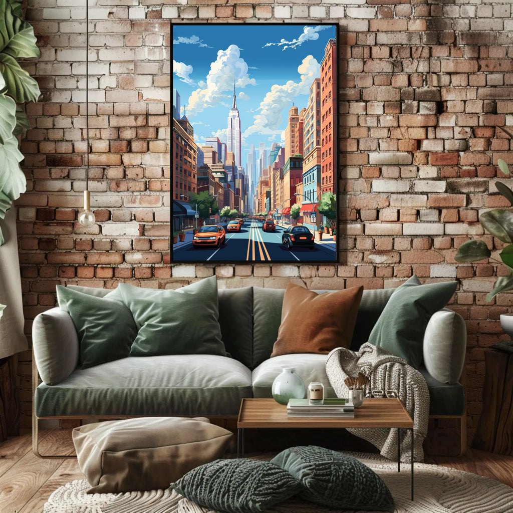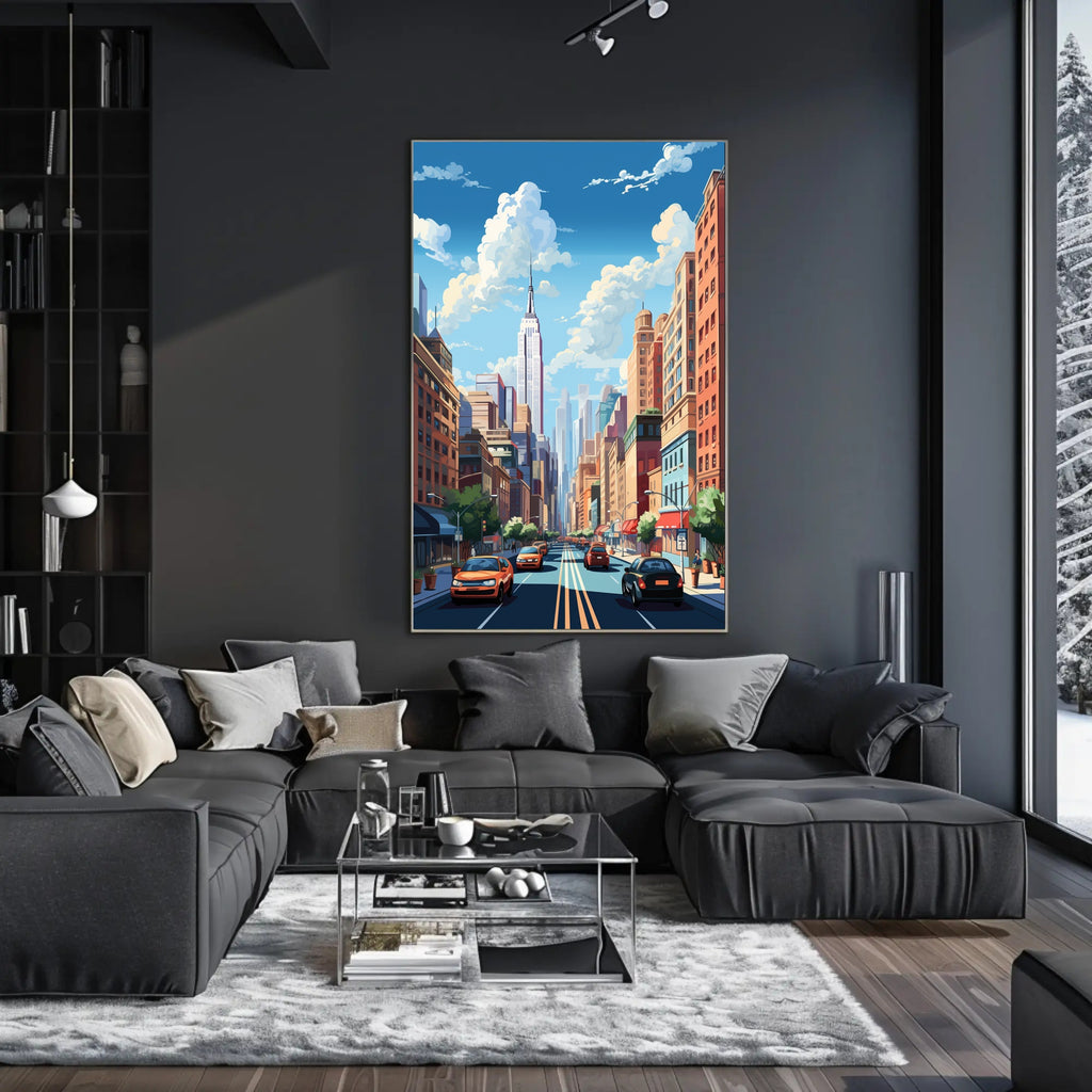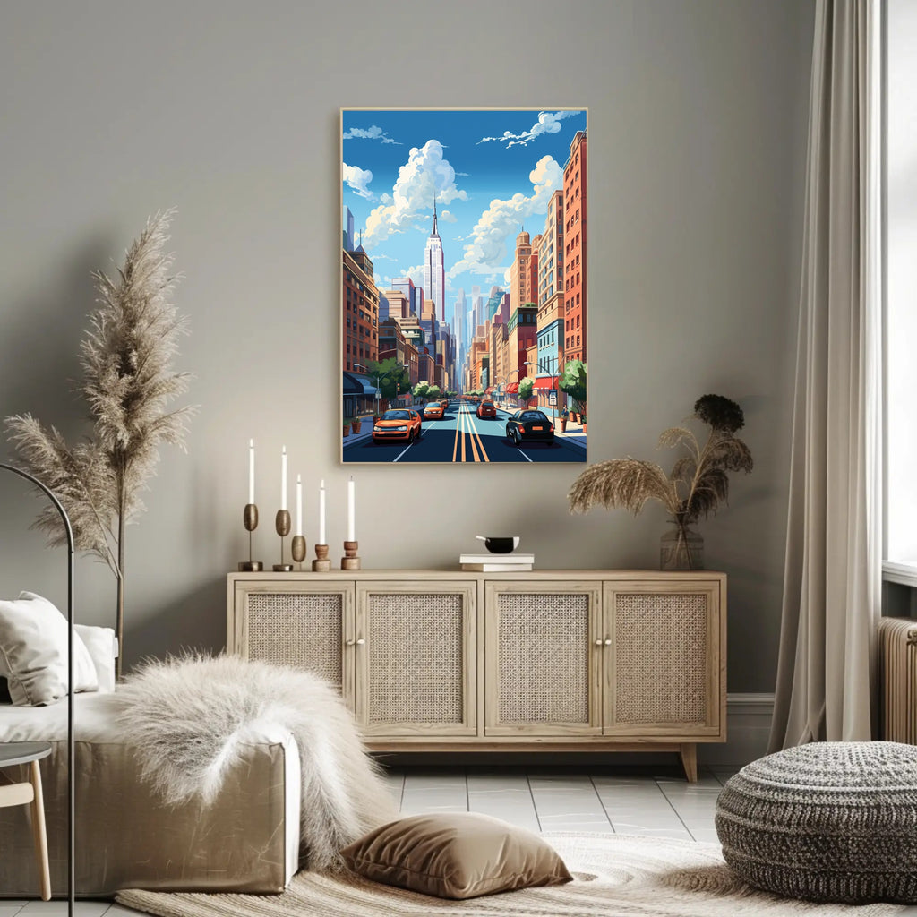 Bring the calm energy of a sunlit skyline into your home with the Cityscape Serenity Poster from PosterGoat. This striking wall art captures a peaceful urban avenue under a brilliant blue sky—towering architecture, soft billowing clouds, and warm street-level details combine in a minimalist, scenic composition that suits modern interiors and travel-inspired spaces.