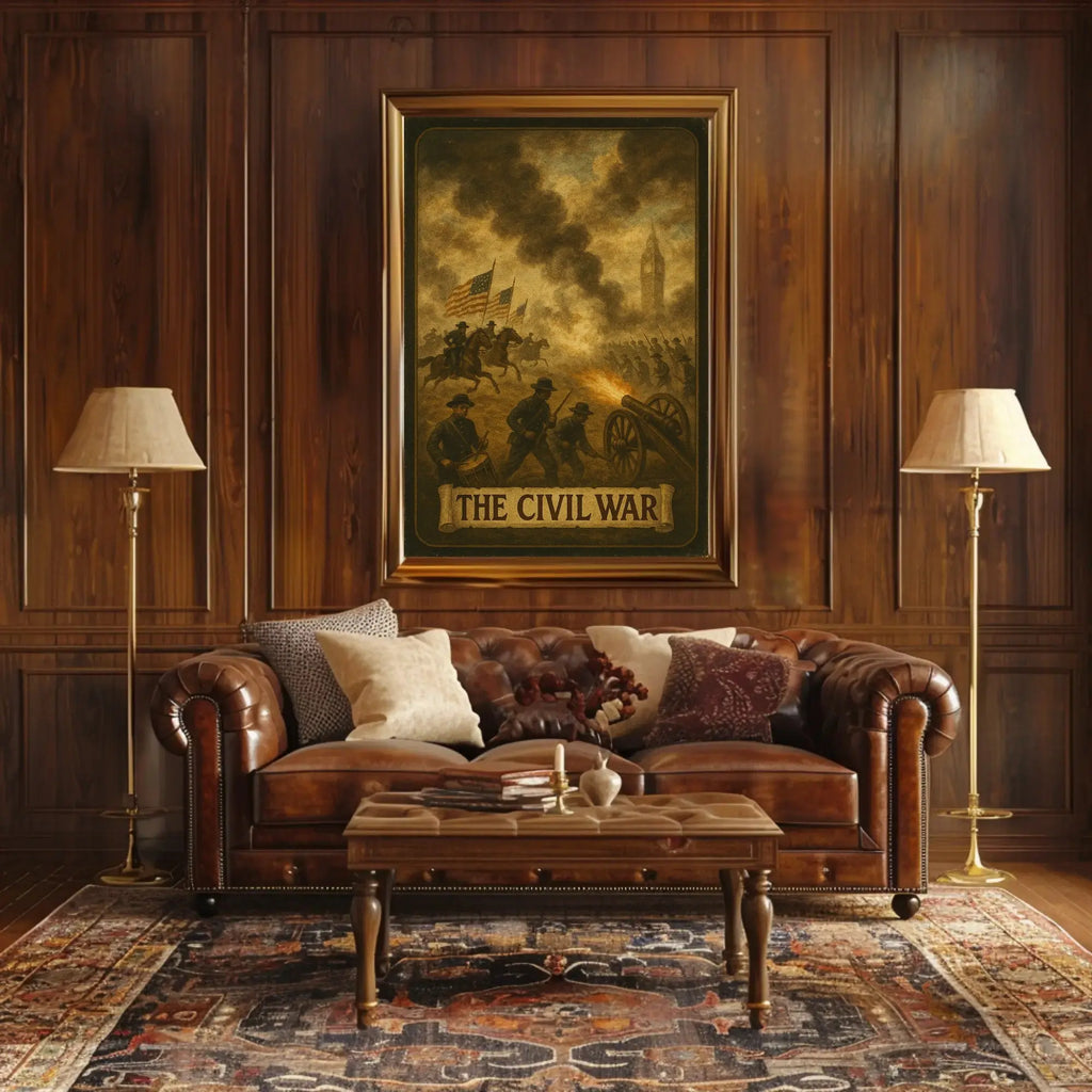 - Authentic period imagery: Detailed illustration of soldiers in military uniforms, horse cavalry, artillery action, and a somber, dramatic atmosphere that evokes the intensity of the American Civil War.