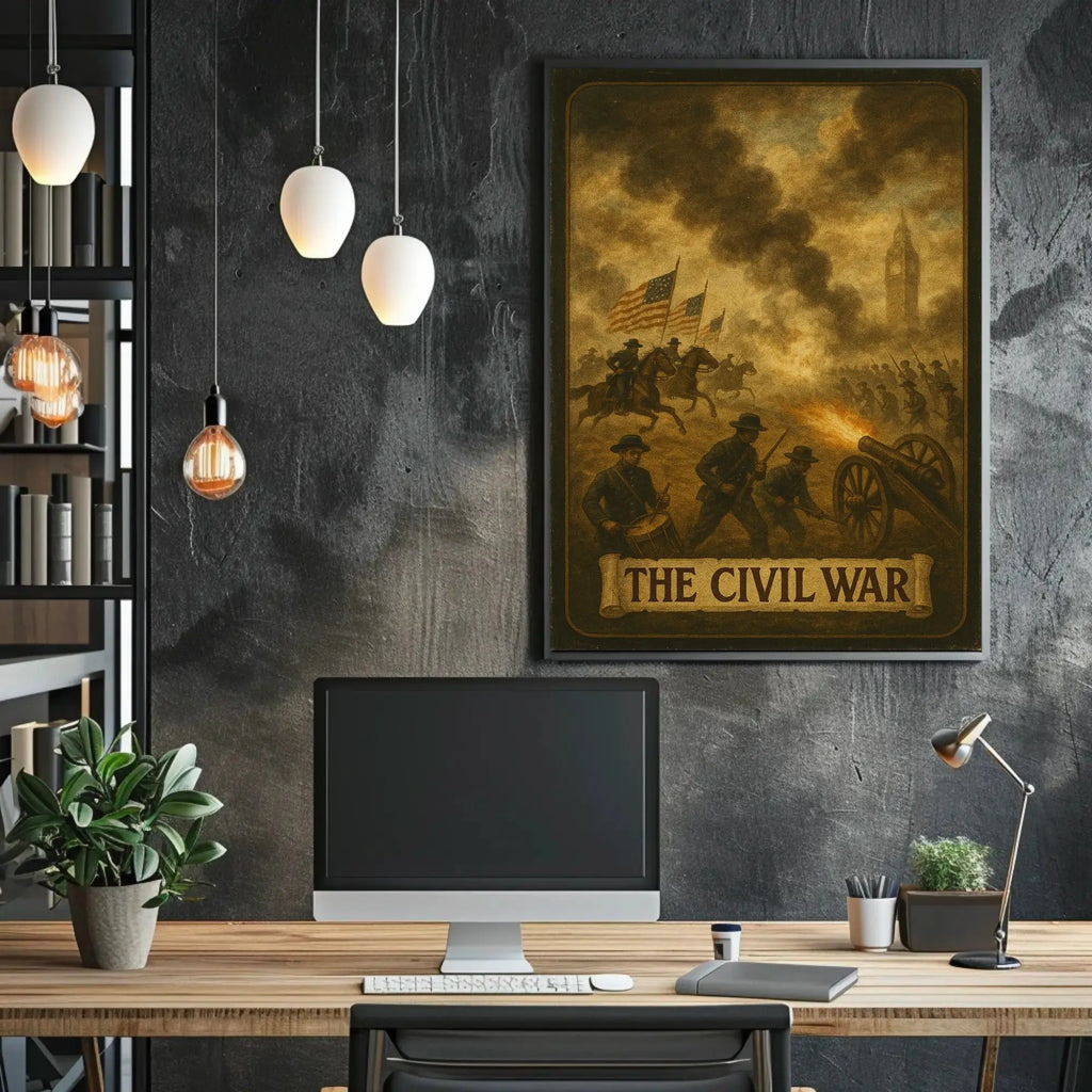 Bring a stirring moment of American history into your home with the Civil War Battle Scene Historical Poster from PosterGoat. This vintage-style print captures the drama of the battlefield—charging cavalry, proud Union flags, a booming cannon, a marcher’s drum, and a hazy, smoke-filled sky rendered in warm sepia tones for authentic aged appeal.