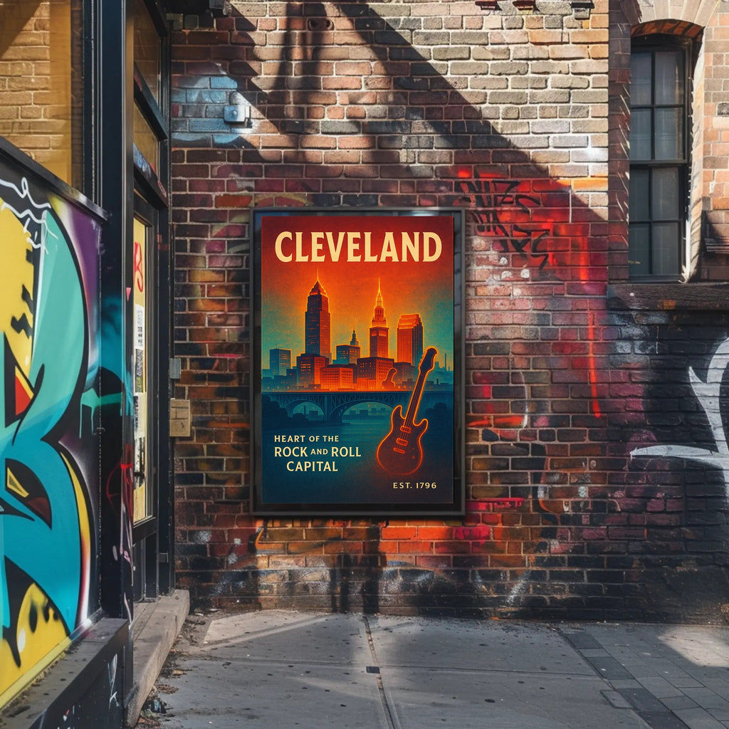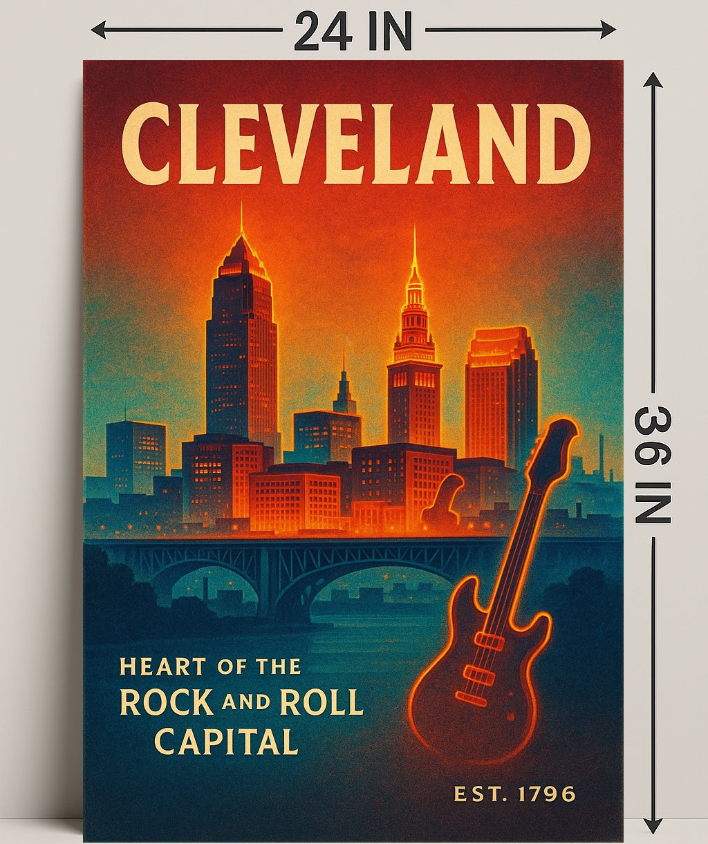 Eye-Catching Design: Featuring iconic Cleveland architecture and a guitar silhouette, this poster captures the essence of the city’s rich musical heritage.