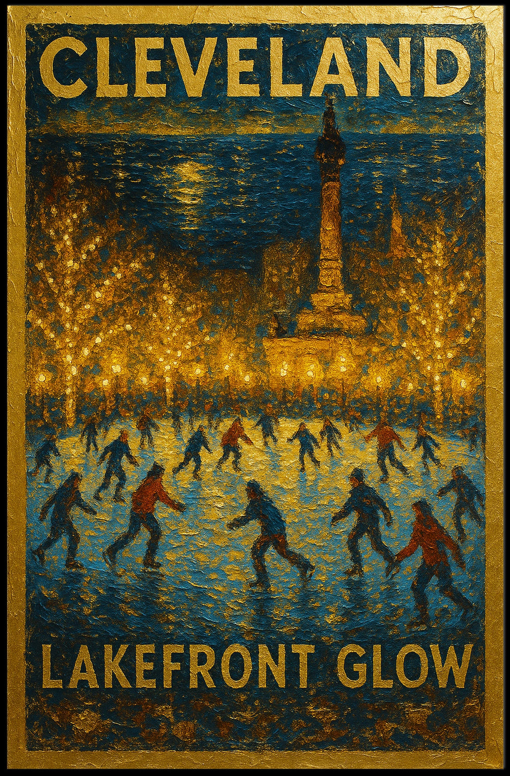- Detailed design highlighting the glow-lit Cleveland lakefront scene