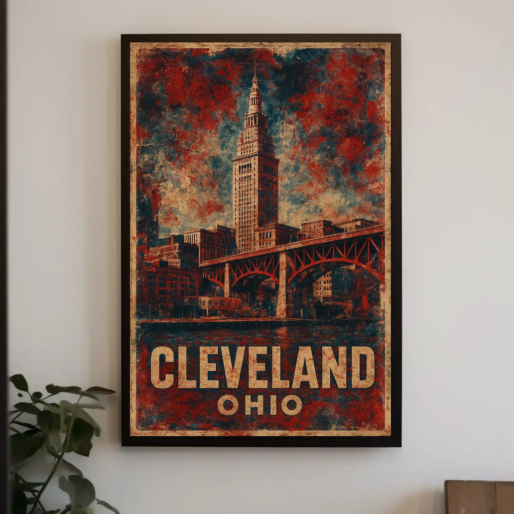 Celebrate the beauty of the Cleveland Terminal Tower Vintage Travel Poster with this timeless wall art. This vintage-style illustration captures Cleveland, Ohio’s iconic skyline, with the Terminal Tower as its focal point and a grand arched bridge weaving through the bustling urban landscape. Warm reds and browns evoke nostalgia while honoring the city's architectural splendor and cultural spirit.