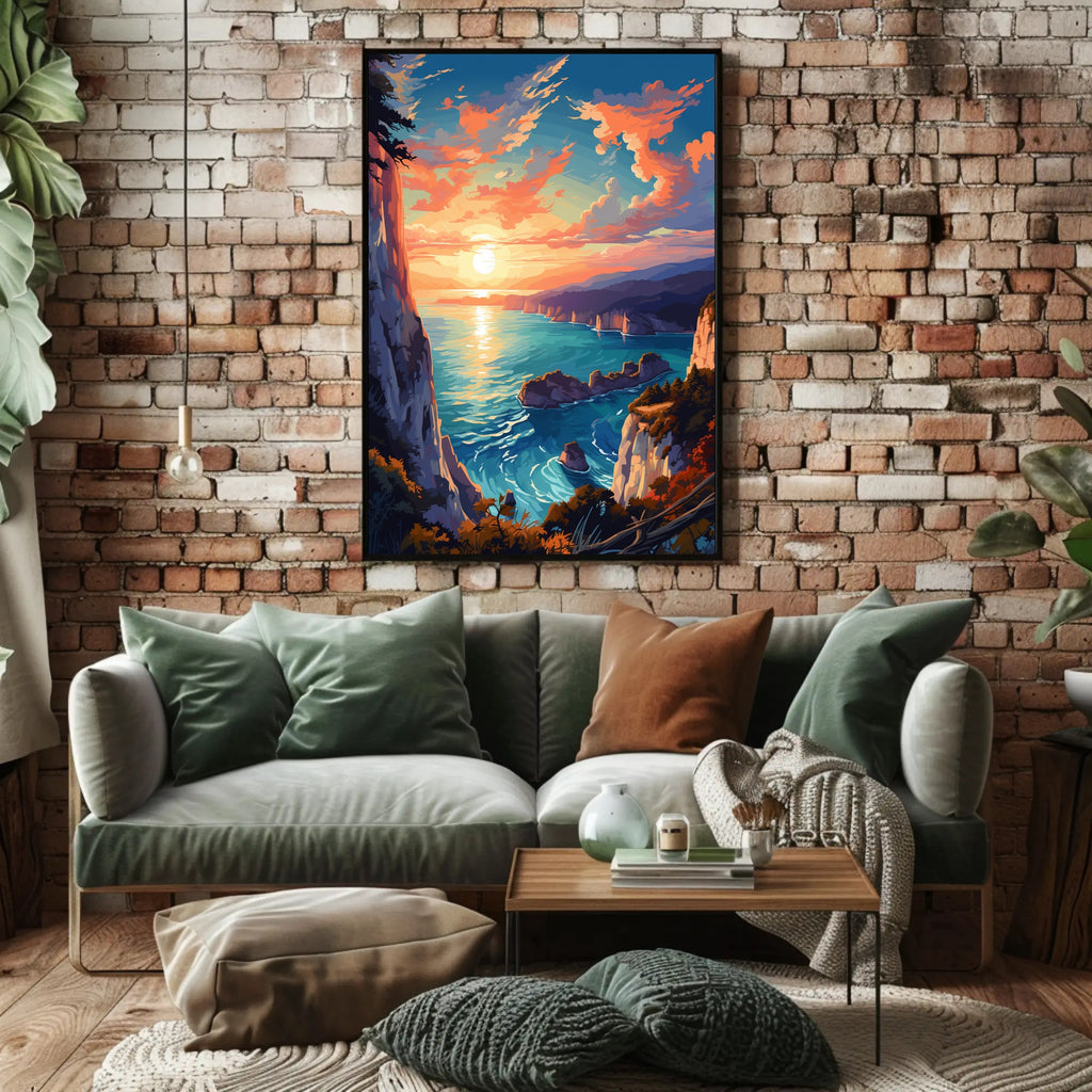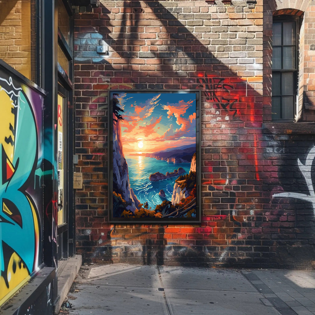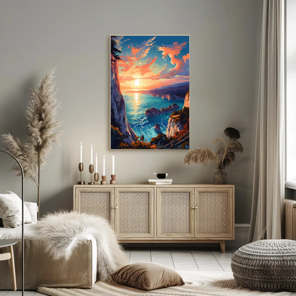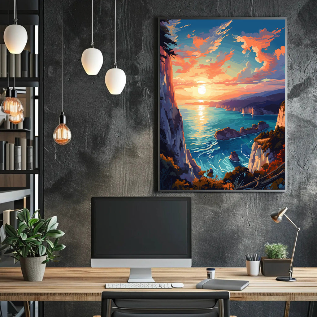 How it transforms your space: Hang the Coastal Sunset Serenity Poster above a console, bed, or workspace to instantly introduce warmth, depth, and a sense of escape — the vibrant reflection on the water and the dramatic cliff edge create a natural focal point that anchors any room.