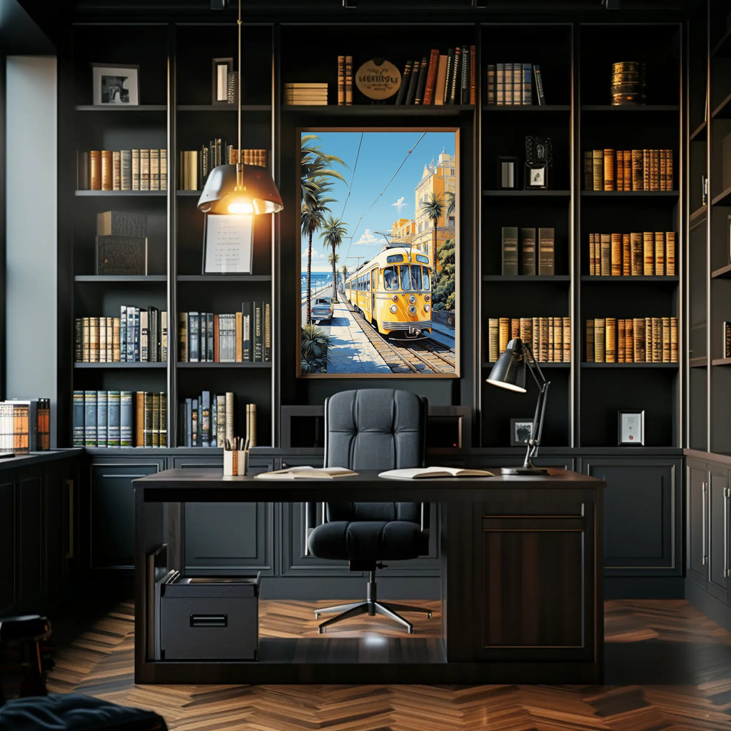 This poster blends travel-inspired storytelling with clean, modern aesthetics, making it a standout piece for living rooms, hallways, offices, or beach-house retreats. The detailed illustration emphasizes bold color contrasts — warm yellows against cool ocean blues — and crisp composition that draws the eye along the tram tracks toward the horizon.
