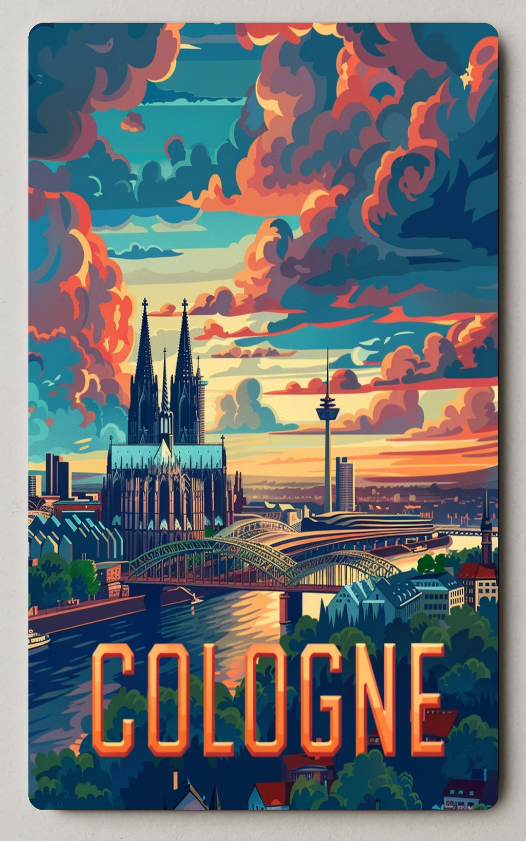 Capture the spirit of Cologne with the Cologne Cathedral Modern Cityscape Urban Trading Card from PosterGoat — a minimalist, artful collectible that transforms a beloved landmark into a bold, modern keepsake. This high-impact trading card features the soaring spires of the Cologne Cathedral set against a dramatic, sunset-drenched skyline rendered in vibrant, saturated colors that pop from every angle.