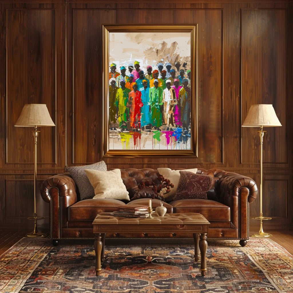 The artwork blends mid-century modern sensibilities with surreal, painterly texture: layered brushwork, expressive splatters and dripping pigments create movement while stylized silhouettes and varied headgear hint at cultural celebration. This energetic composition makes a striking focal point for living rooms, offices, or creative spaces.