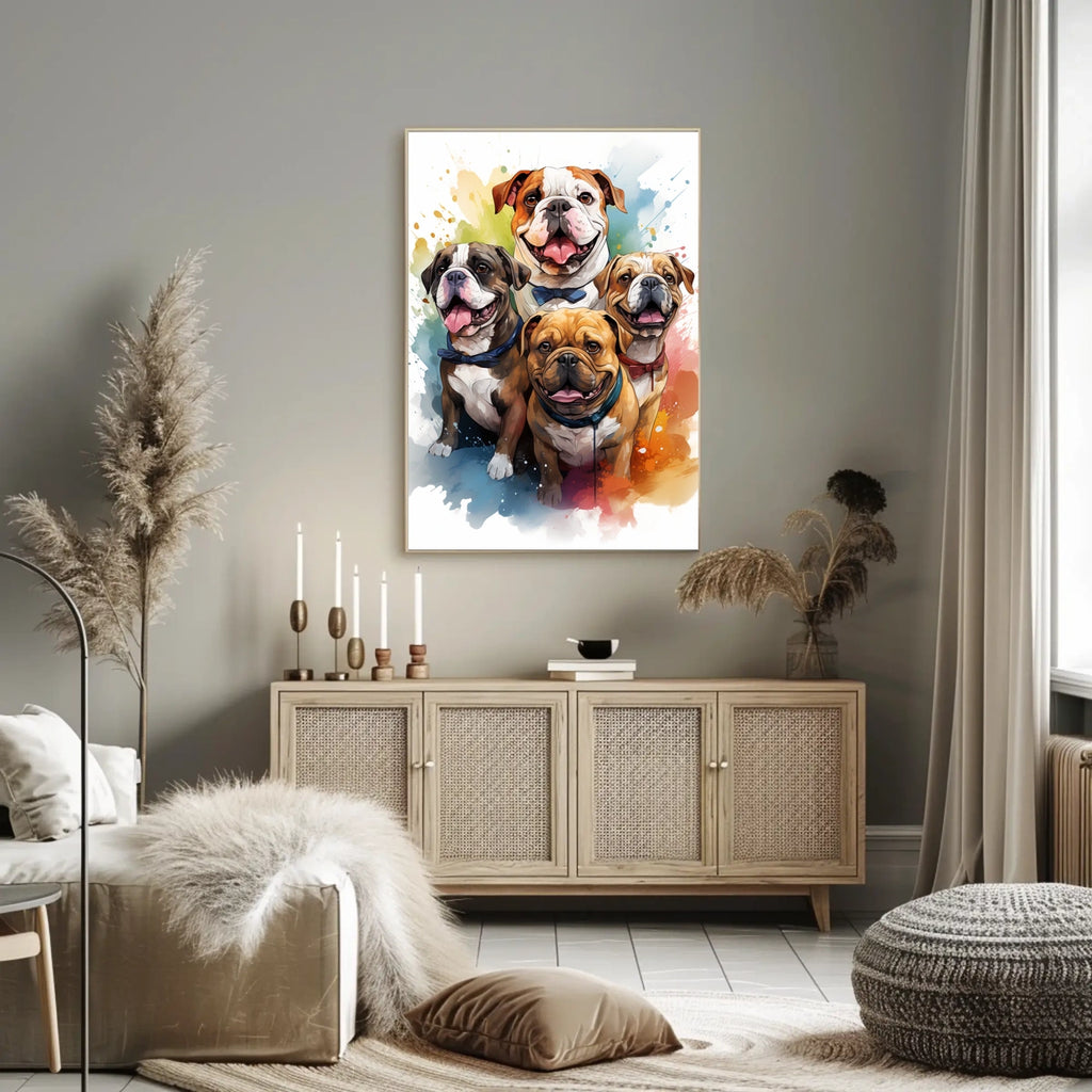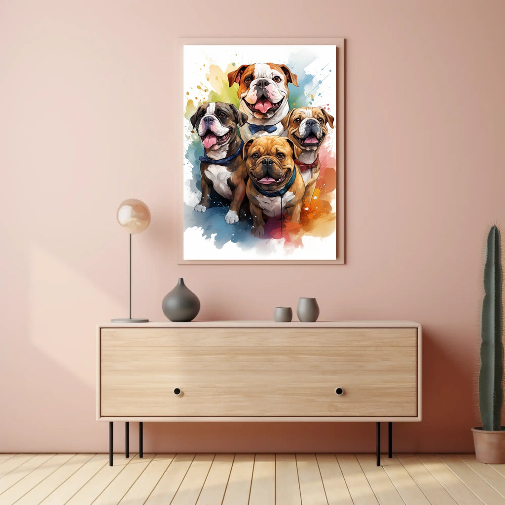 Transform your space with this vibrant bulldog art poster, showcasing a playful illustration of four charming bulldogs, each adorned with a unique colored bow tie. The dynamic background bursts with a kaleidoscope of colors, exuding energy and life. Crafted in a modern and expressive style, the artwork emphasizes bold colors and lively brushstrokes, capturing the joyful essence of these beloved pets.