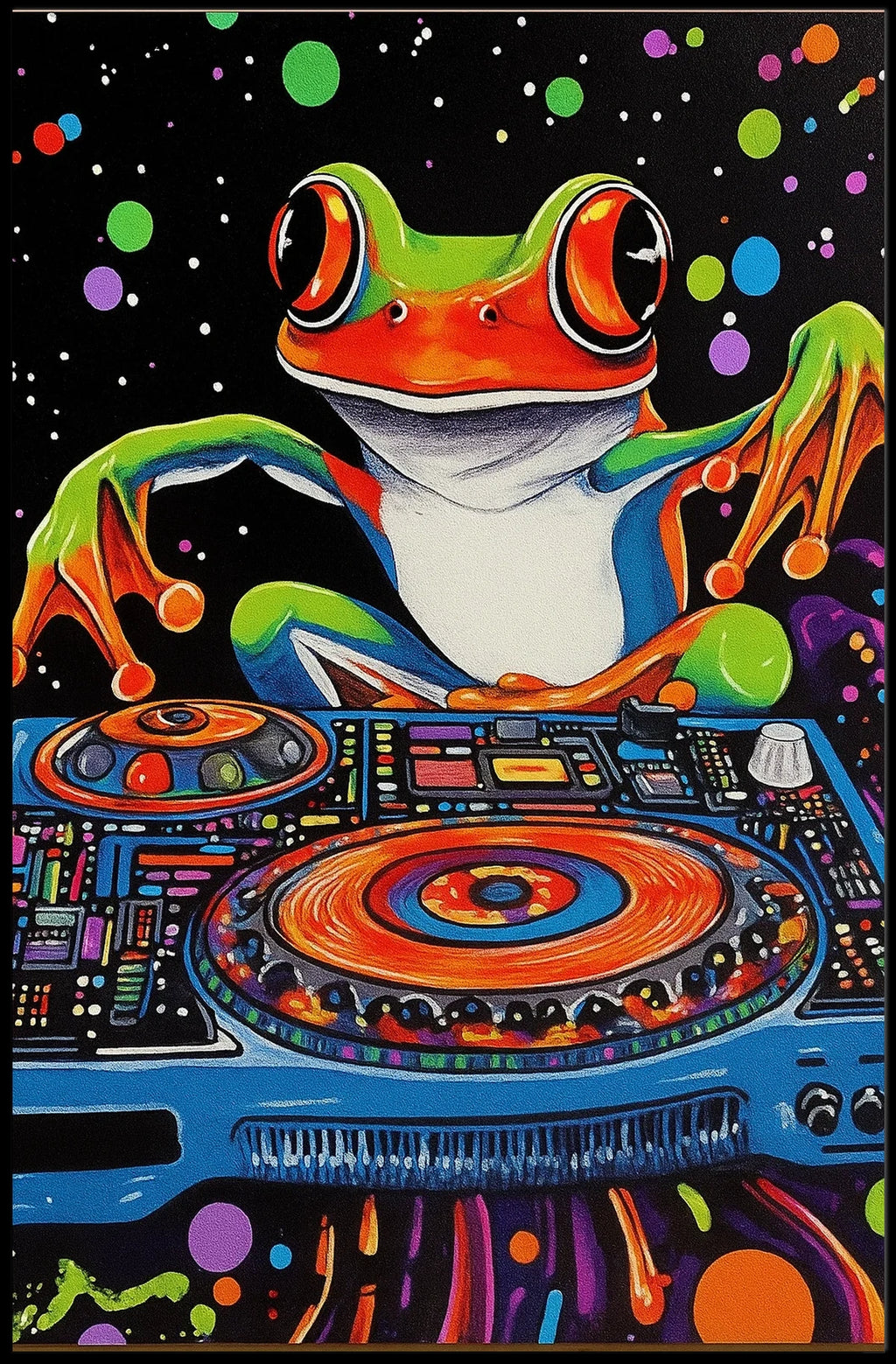 Dive into an invigorating world of sound and color with this poster's surreal illustration of a frog taking charge at the DJ booth. Amidst whirling vibrant patterns and striking hues, the image oozes an imaginative sense of fun and energy. The lively and playful theme illuminates any room, adding a splash of artistic exuberance to your décor. This mesmerizing piece not only awakens the senses but also serves as a versatile complement to creative spaces like music studios, entertainment rooms, or trendy cafes looking for a touch of whimsy integrated into their ambiance.
