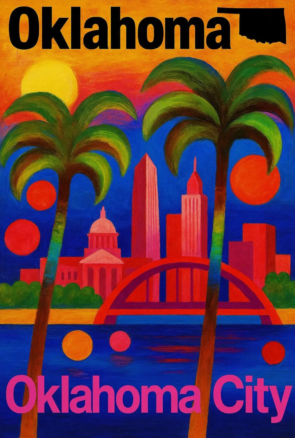 Bring the vibrant pulse of Oklahoma City to your wall with this Colorful Oklahoma City Abstract Skyline Art Poster from PosterGoat. Bold, pop-art inspired hues — warm oranges and reds contrasted with deep blues and greens — create an energetic cityscape accented by stylized palm trees, a curving bridge, and sun-like orbs that give the piece a modern, mid-century flair.