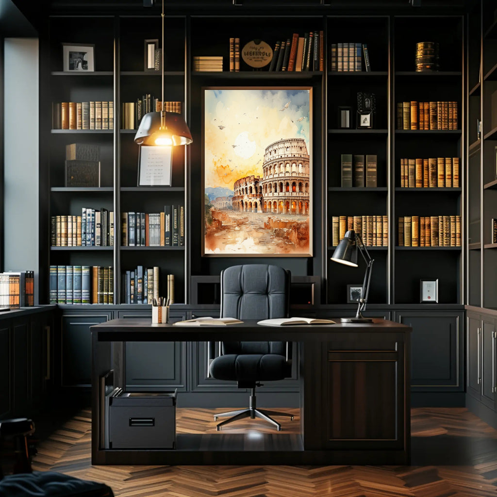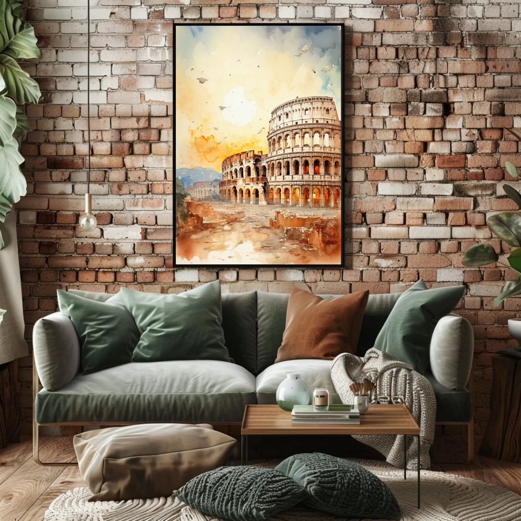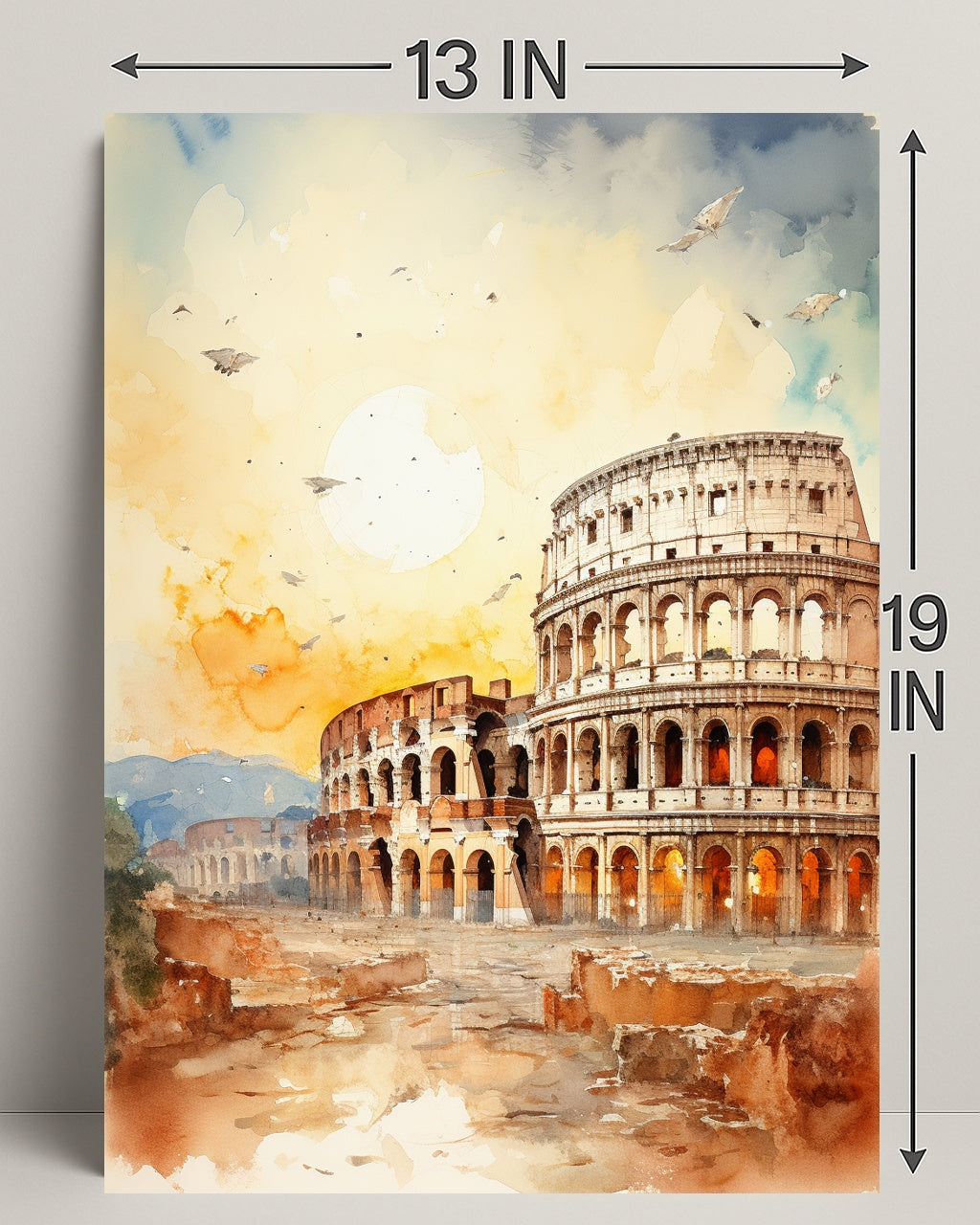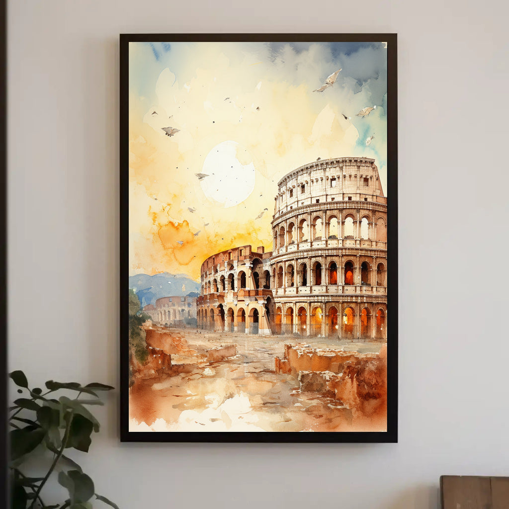 Colosseum At Sunset Poster by PosterGoat captures the timeless grandeur of Rome in a warm, watercolor-inspired composition that elevates any room. Sunlit oranges blend into soft blues as the Colosseum stands bathed in sunset glow, detailed with architectural arches, weathered stone textures, and drifting birds that add movement and depth.