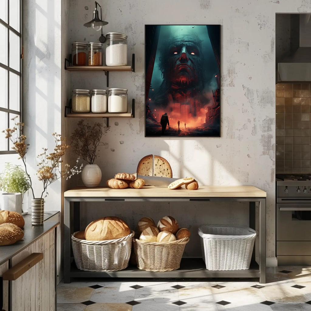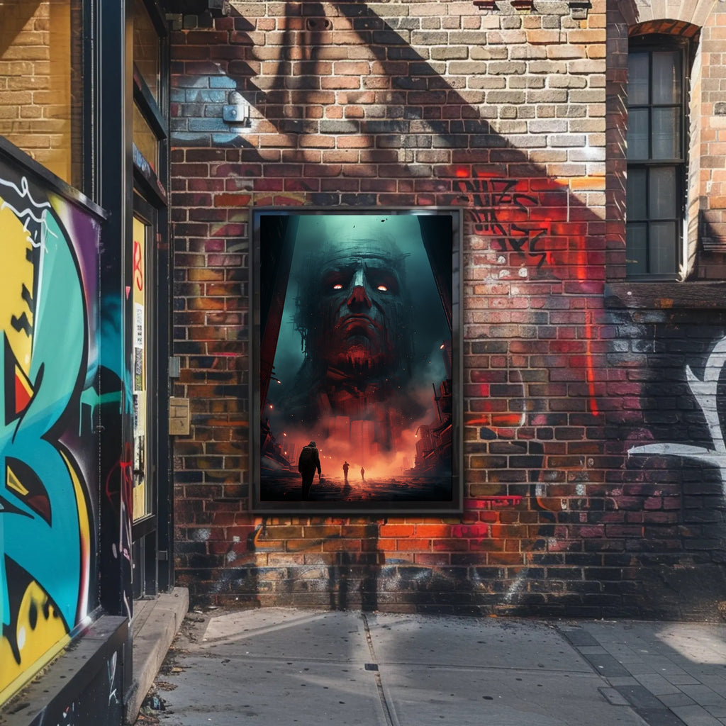 Why collectors and décor lovers choose this poster: the high-contrast palette of deep teal and molten red delivers instant visual impact, while detailed textures — from carved stone features to crumbling urban scaffolding — reward close inspection. Its cinematic composition works equally well as a bold centerpiece over a couch, above a console, or as part of a curated gallery wall in modern interiors.