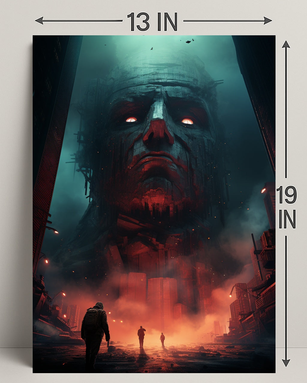Bring a dramatic, cinematic focal point to your home or office with the Colossus Of The Future Poster from PosterGoat. This striking poster depicts a towering, weathered colossus head rising from a ruined cityscape — glowing eyes cutting through teal haze while fiery red-orange mist and embers sweep the streets below. The scale is breathtaking: tiny figures traverse a cracked, reflective ground toward the monumental visage, creating a mood of awe, mystery, and futuristic epicness.