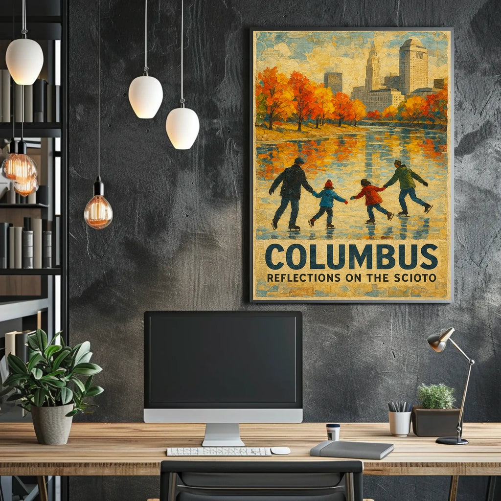 Whether displayed in a living room, study, or workspace, this wall art brings a touch of wanderlust and a nod to Columbus's scenic Scioto River landscape. It's the perfect gift for art lovers, travelers, and anyone who cherishes scenic poster art.