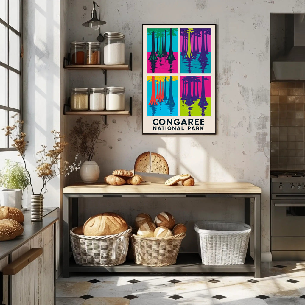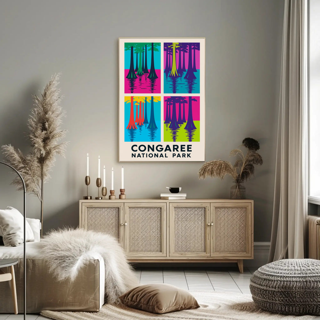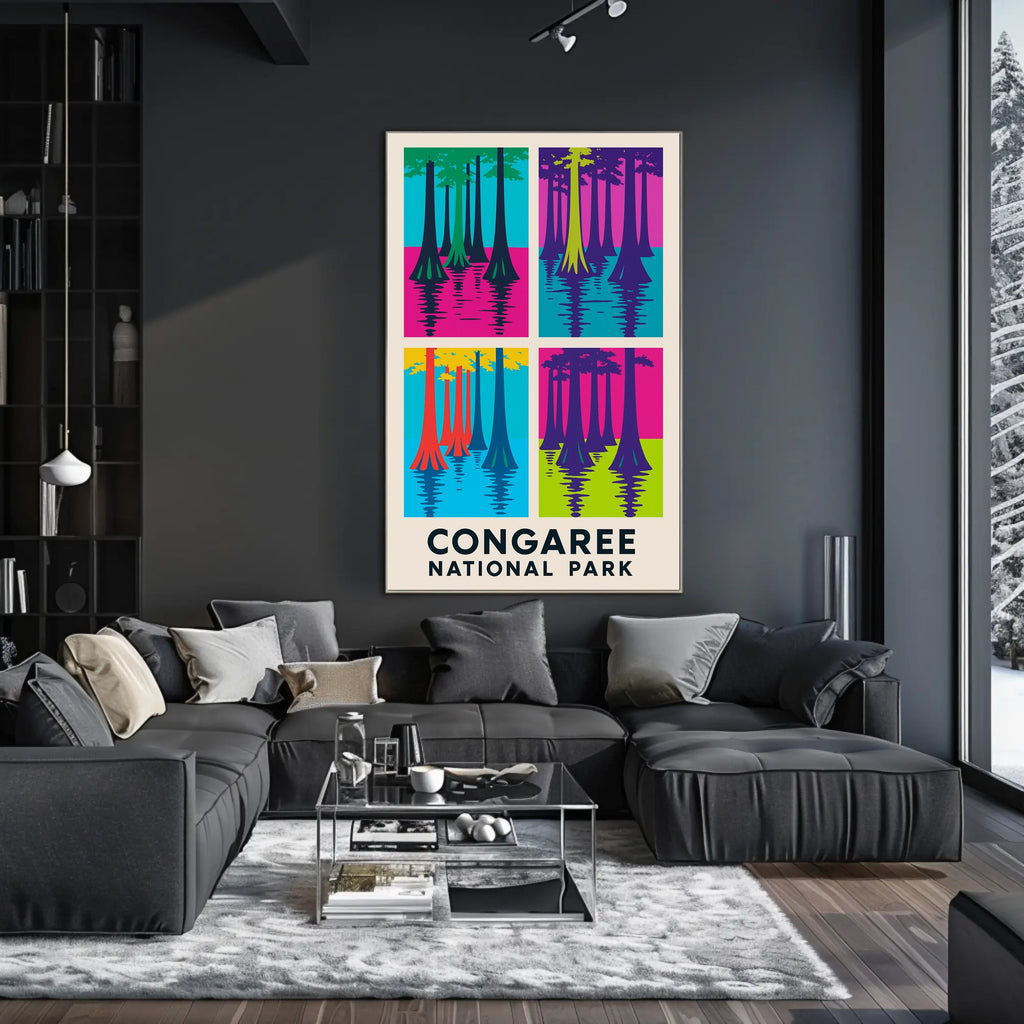 Bring the wild beauty of Congaree National Park into your home with this vibrant, pop‑art poster from PosterGoat. Four bold panels showcase towering cypress trees and mirrored water reflections in bright, high‑contrast colors—an eye‑catching piece that transforms any wall into a statement of adventure and nature decor.