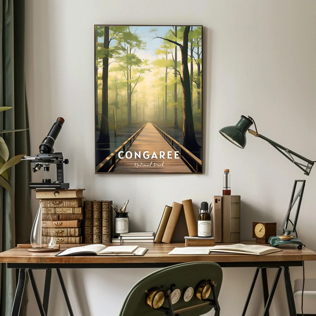 Bring the peaceful magic of Congaree National Park into your home with this Tranquil Forest Walk poster from PosterGoat. A sun-dappled wooden walkway stretches into a misty cypress swamp, framed by soaring tree trunks and soft, diffused light — a modern illustrative take on a timeless nature scene that invites calm and reflection.