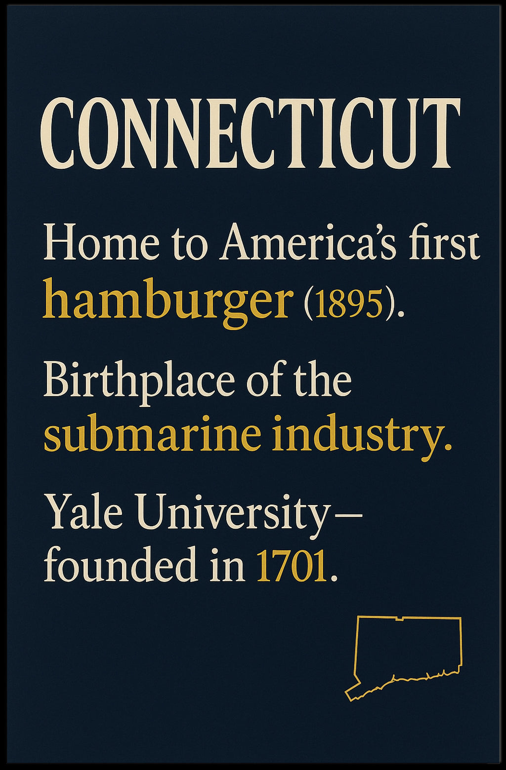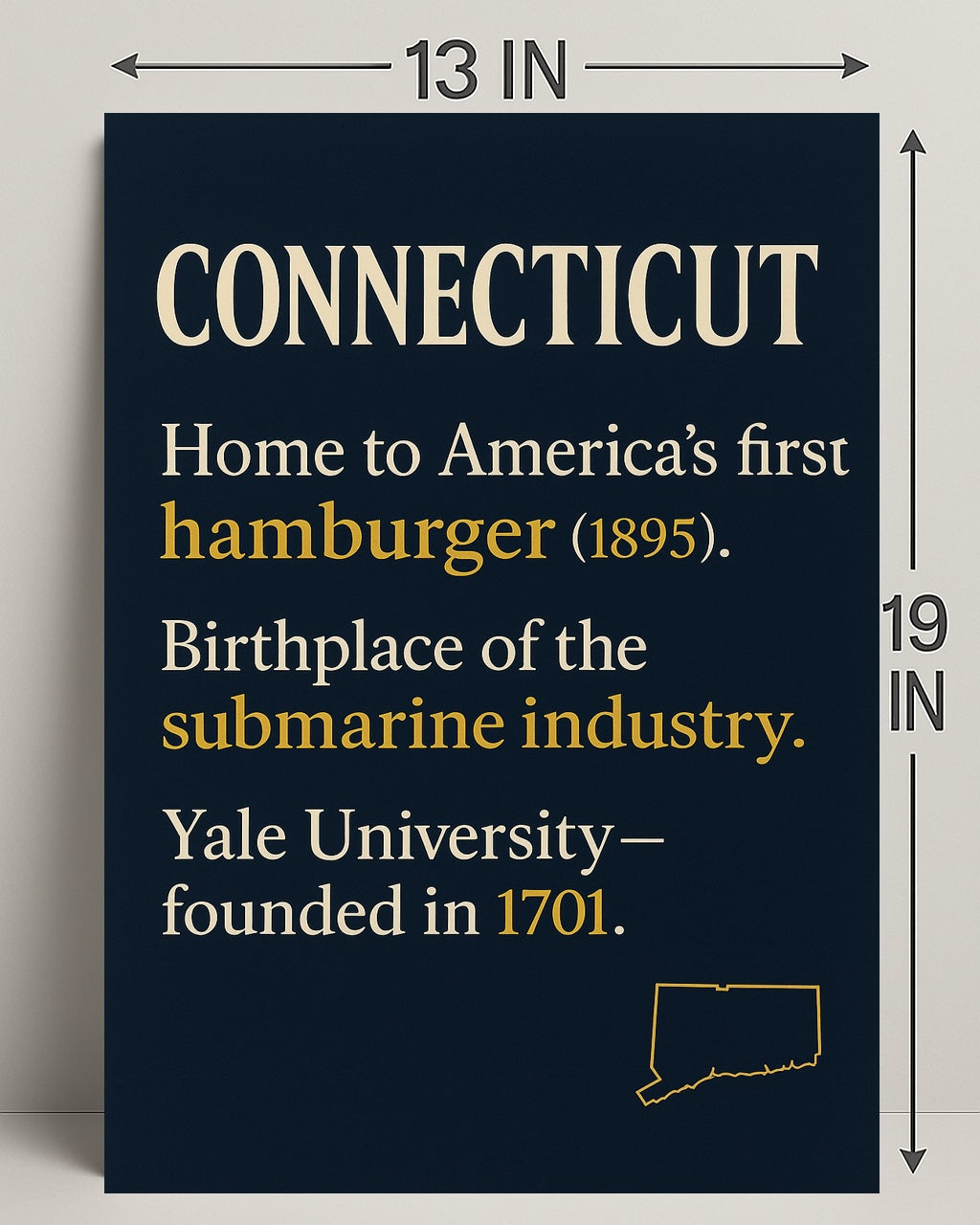 Elevate your home decor with the Connecticut Highlights Poster. Perfect for those who cherish beautiful art and rich history, this piece is more than just a decoration—it's a celebration of Connecticut. Order yours today and bring a slice of Connecticut into your home!