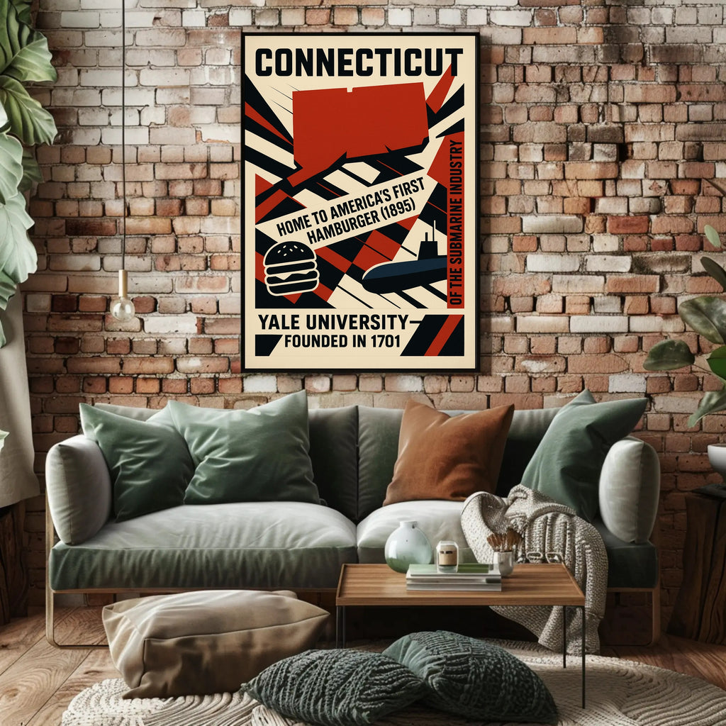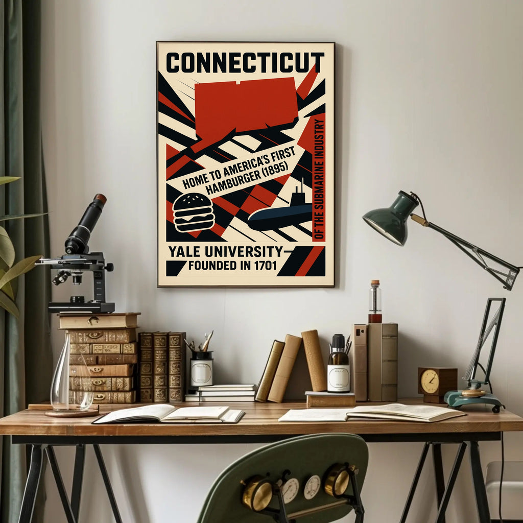 Celebrate Connecticut's spirit with the Connecticut Highlights Poster from PosterGoat — a vintage-inspired art print that blends bold graphic design with local landmarks and fun historical facts. Featuring a striking red silhouette of the state, dynamic black-and-cream geometry, and iconic imagery (a submarine, a hamburger motif and a nod to Yale University), this poster is a conversation-starting piece for any home, office, or dorm wall.