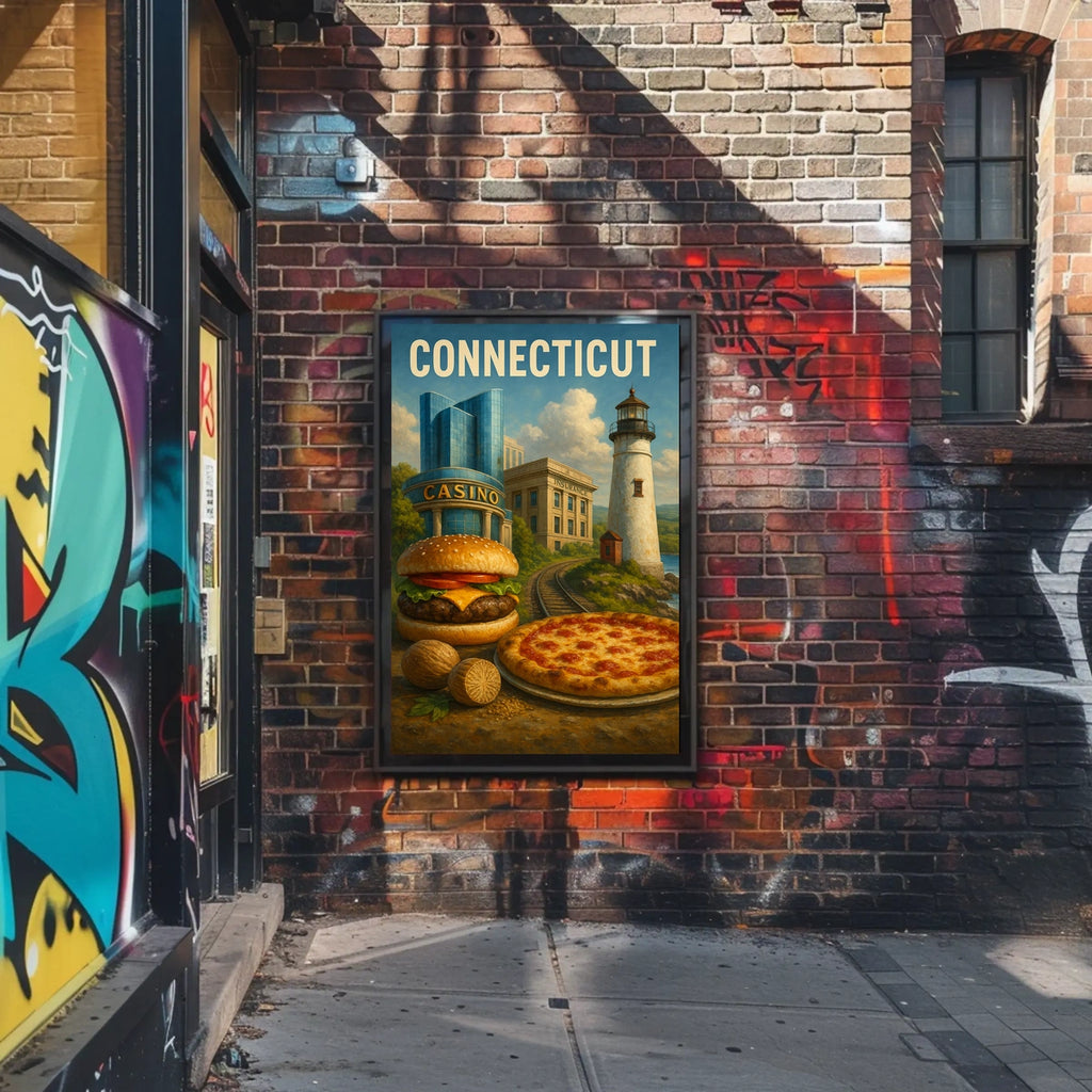 - Detailed design highlighting iconic Connecticut landmarks and local cuisine