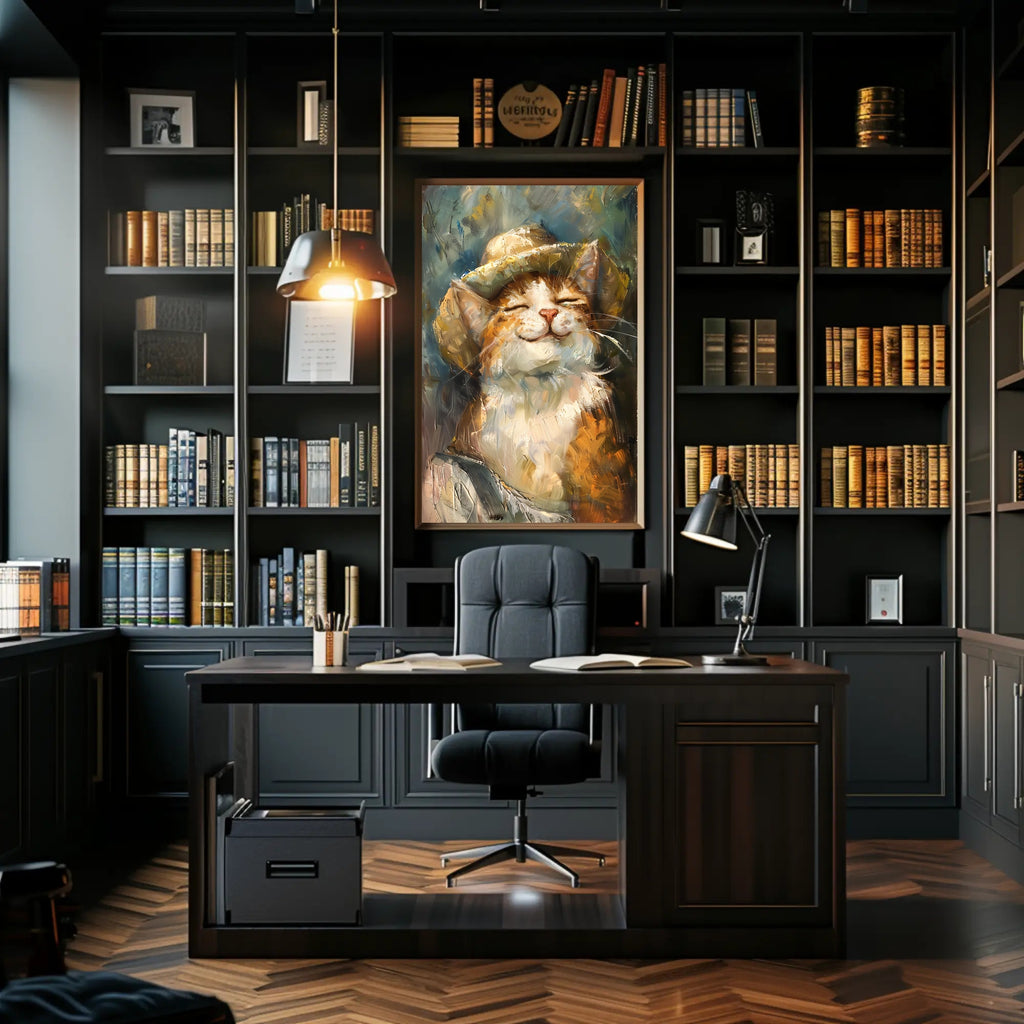 Experience the whimsical charm of this stunning animal poster, featuring a delightful, fluffy cat adorned in a cute straw hat. Set against a backdrop of abstract, blurred colors reminiscent of a serene natural setting, this impressionistic artwork captures the joyful essence of the feline, with its orange and white fur and content smile. The bold, textured brushstrokes bring life and motion to this artistic piece, evoking a sense of warmth and tranquility. A perfect addition for art lovers and cat enthusiasts alike, this poster is sure to add personality to any space.