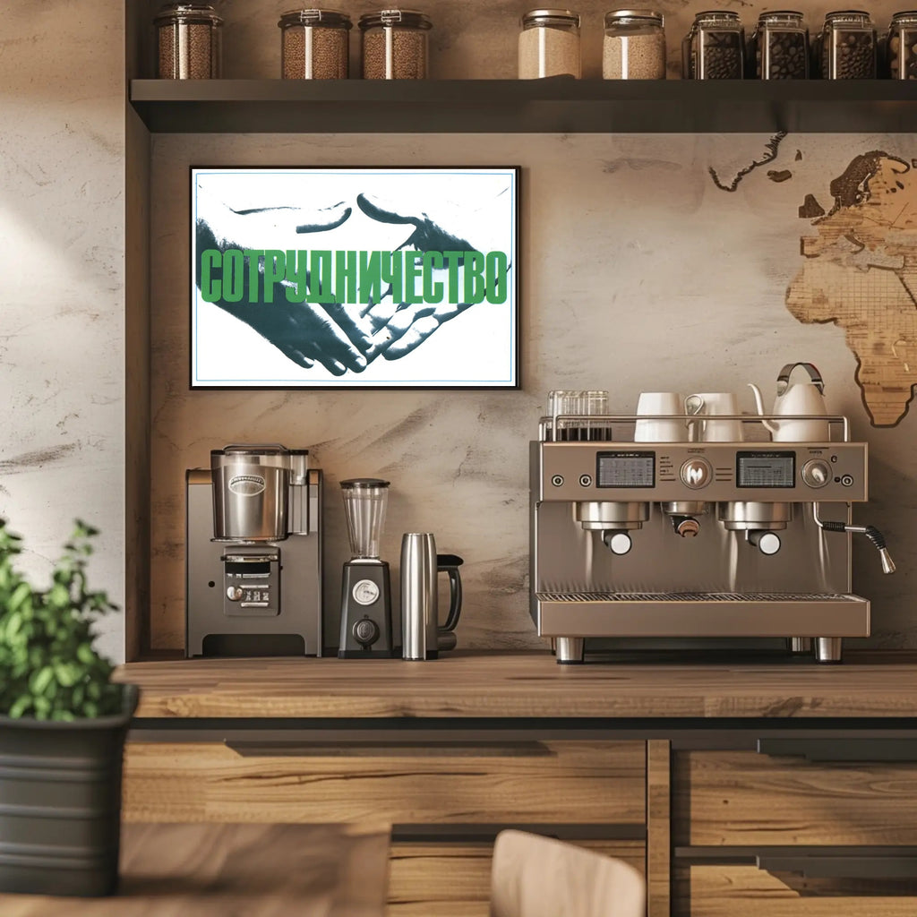 Cooperation Poster from PosterGoat brings a striking blend of vintage propaganda style and modern minimalism to your walls. Bold green Cyrillic lettering overlays a high-contrast duo-tone image of two hands meeting — a powerful visual symbol of partnership, unity, and shared purpose that instantly anchors any room.