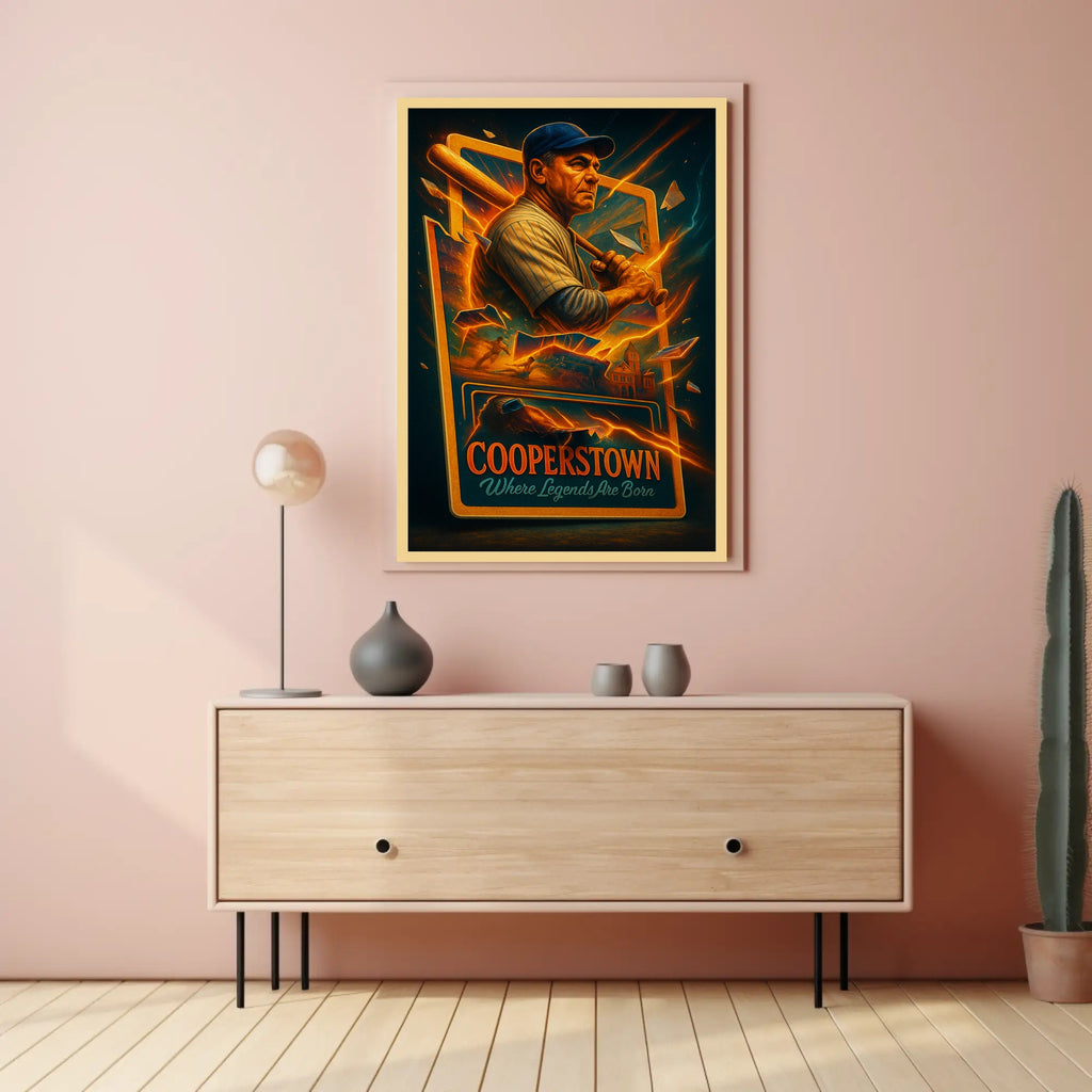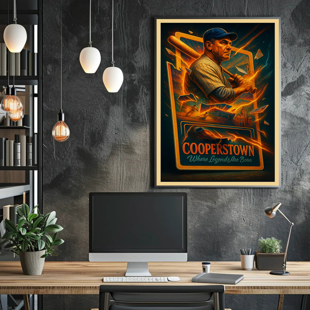 Bring the spirit of baseball history into your home with the Cooperstown Legends Are Born Wall Art Print by PosterGoat. This striking poster captures a weathered batter poised with his bat, framed by electrifying orange highlights and vintage-inspired typography that proclaims "Cooperstown — Where Legends Are Born." The dramatic, painterly composition and rich teal-and-amber palette create a cinematic focal point perfect for dens, man caves, game rooms, or gallery walls.