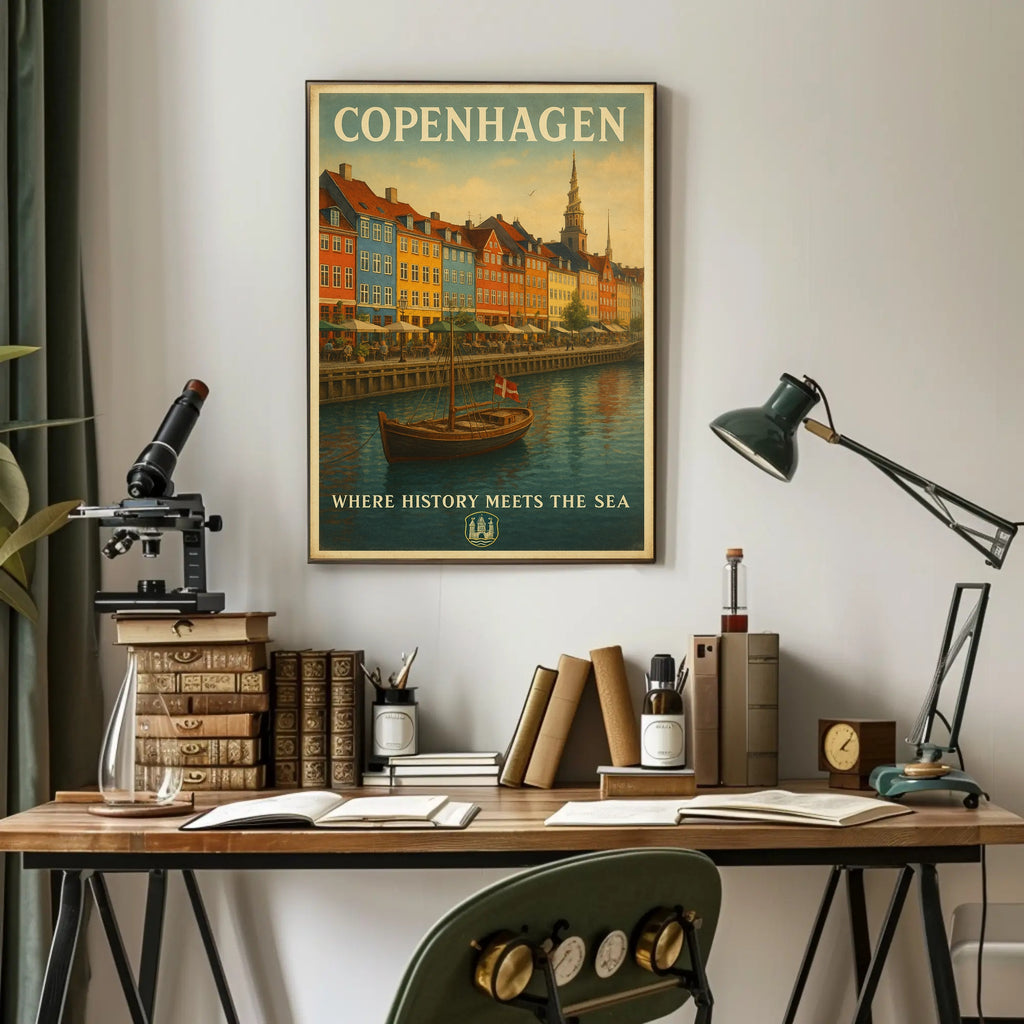 Copenhagen Waterfront Nyhavn Vintage Travel Scene Poster — a timeless print from PosterGoat that brings the charm of Denmark’s historic Nyhavn district to your walls. This vintage-style poster captures a serene harbor scene with colorful buildings reflected in a tranquil canal, evoking maritime history and nostalgic travel memories.