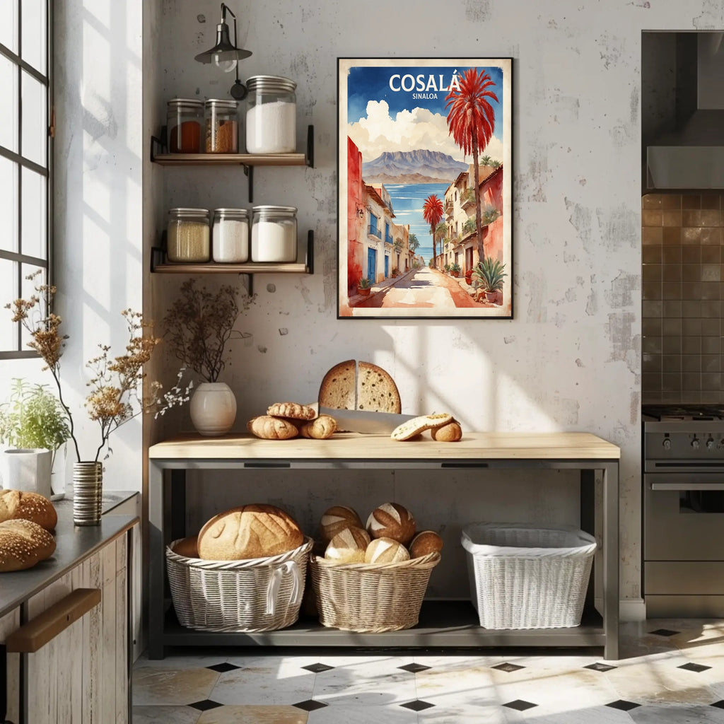 Step into the sun-drenched streets of Cosalá with this evocative travel poster from PosterGoat. Rendered in a mid-century watercolor style, the artwork captures a picturesque Mexican street scene—classic mid-20th-century architecture, bright blue doorways and shutters, towering red palm trees, and a sweeping mountain-and-sea backdrop that feels both nostalgic and timeless.