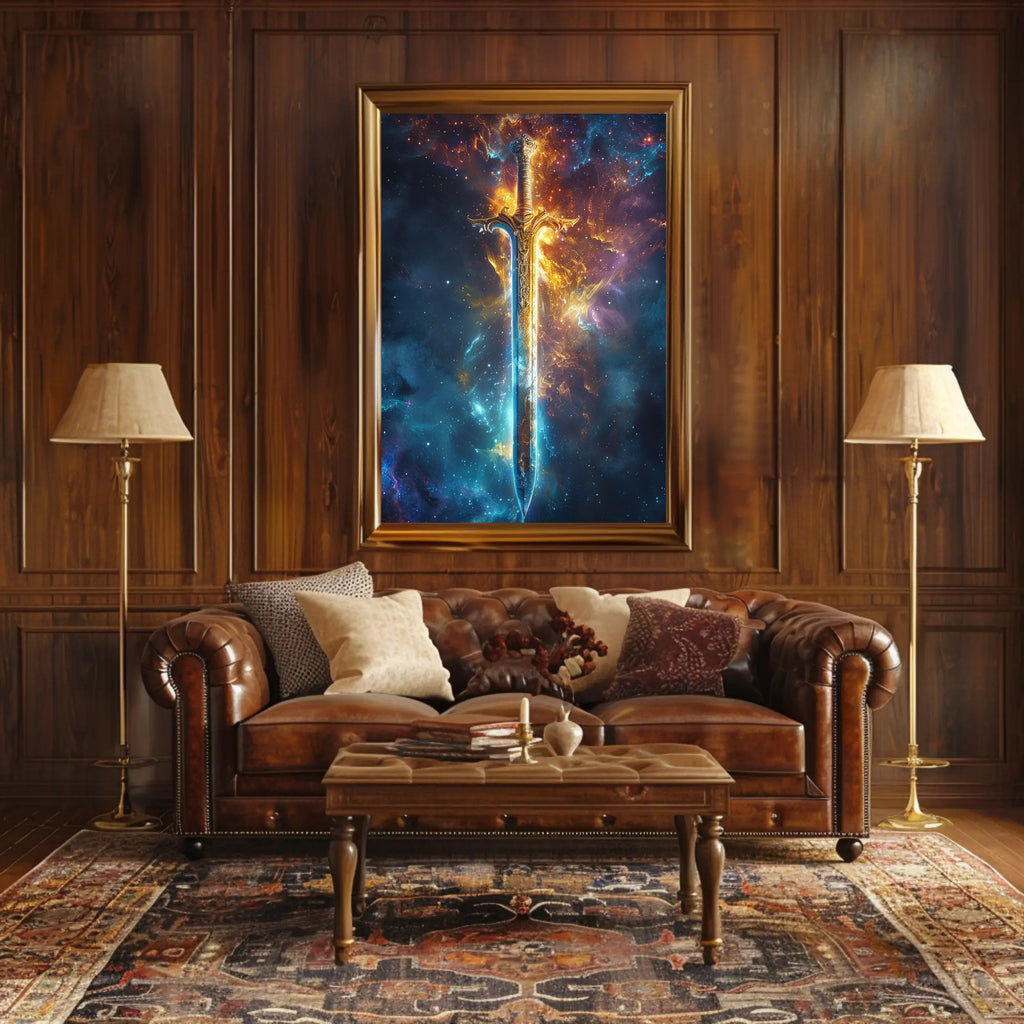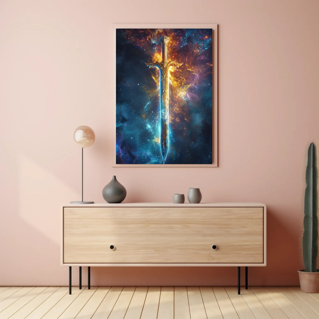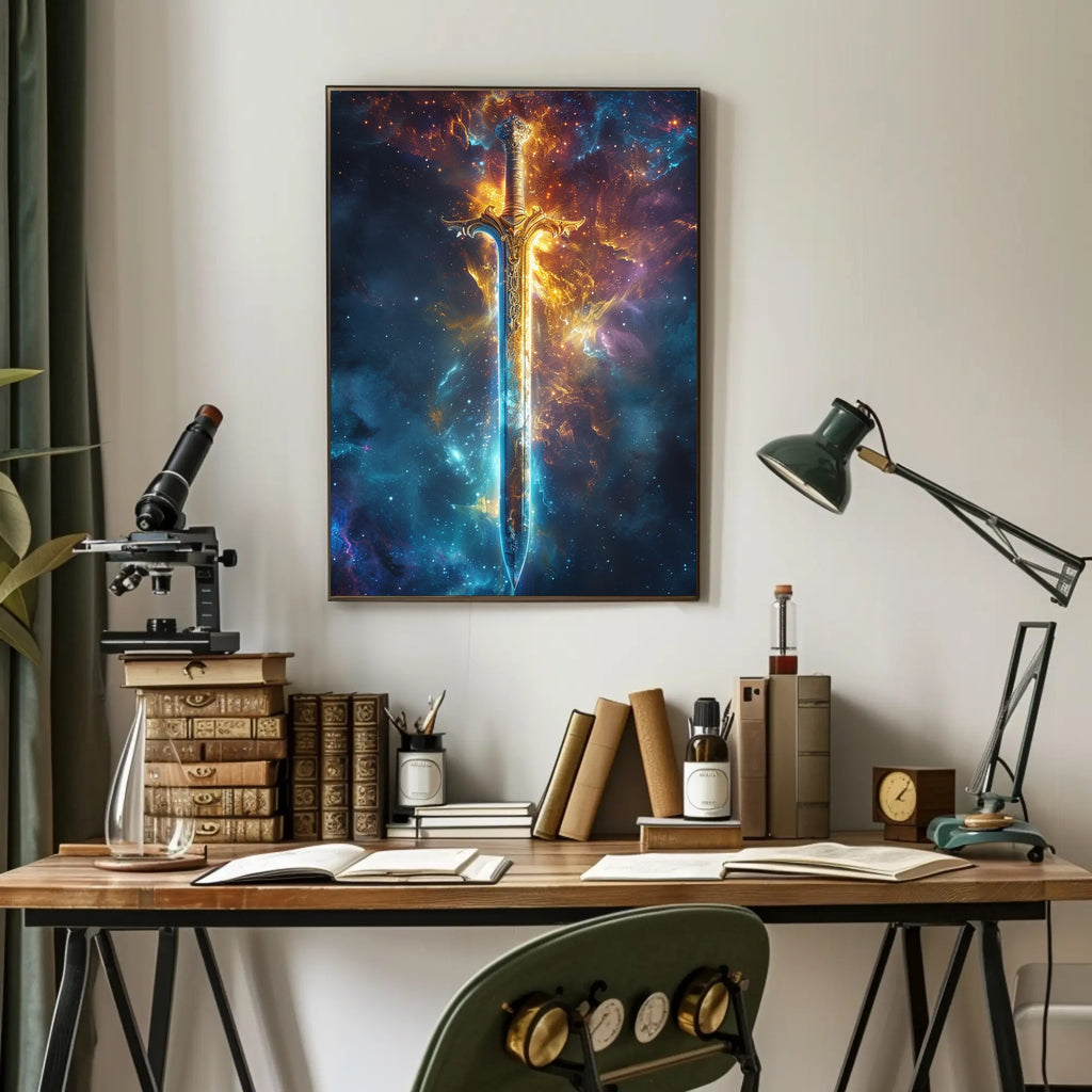 Bring cosmic wonder and heroic energy to your walls with the Cosmic Blade Art Print Poster from PosterGoat — a striking fusion of fantasy and space art crafted for home decor and wanderlust enthusiasts. This vertical poster features an ornate, rune-etched sword suspended in a vivid nebula of electric blues and molten golds, creating a dynamic focal point that draws the eye and ignites the imagination.