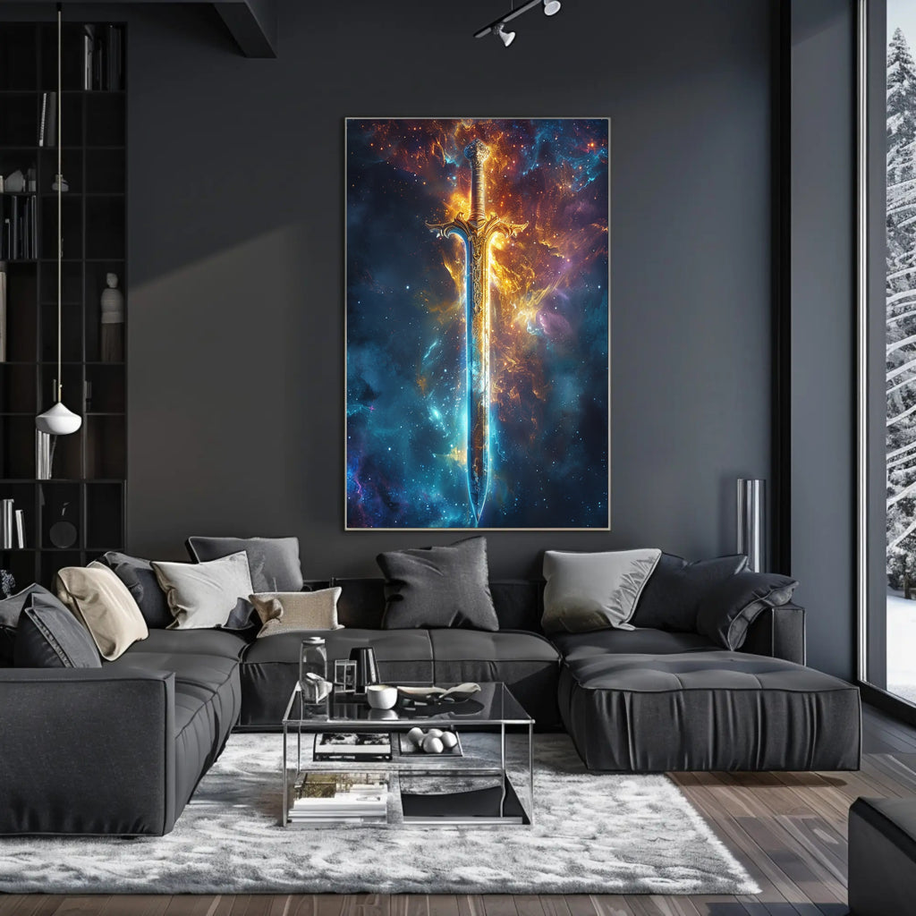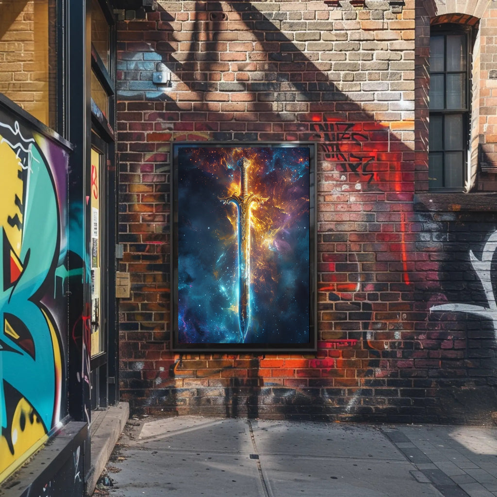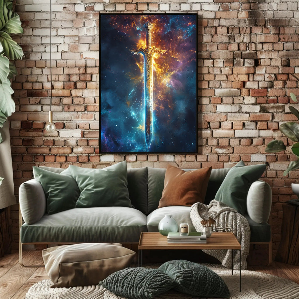 Bring cosmic wonder and heroic energy to your walls with the Cosmic Blade Art Print Poster from PosterGoat — a striking fusion of fantasy and space art crafted for home decor and wanderlust enthusiasts. This vertical poster features an ornate, rune-etched sword suspended in a vivid nebula of electric blues and molten golds, creating a dynamic focal point that draws the eye and ignites the imagination.