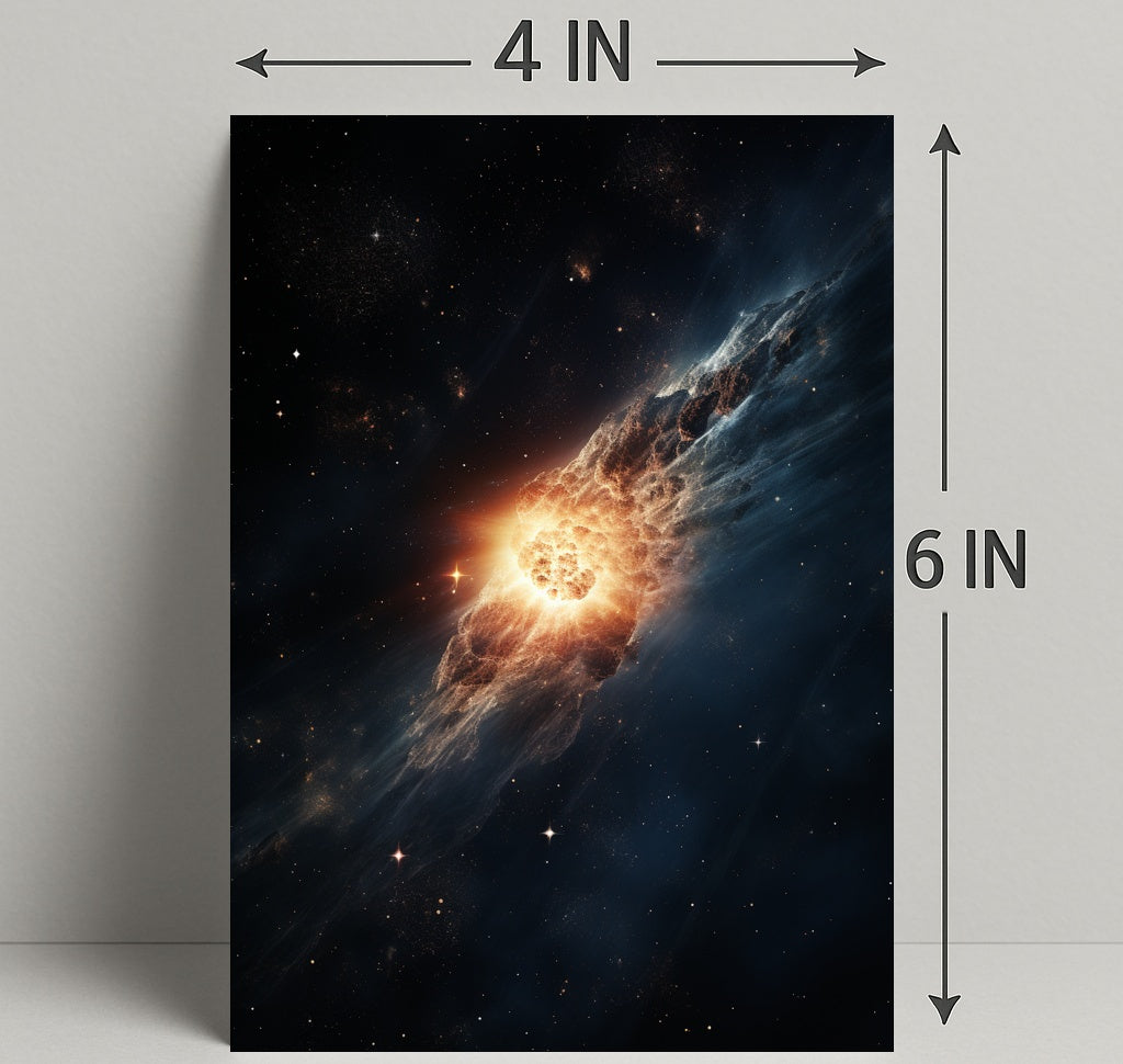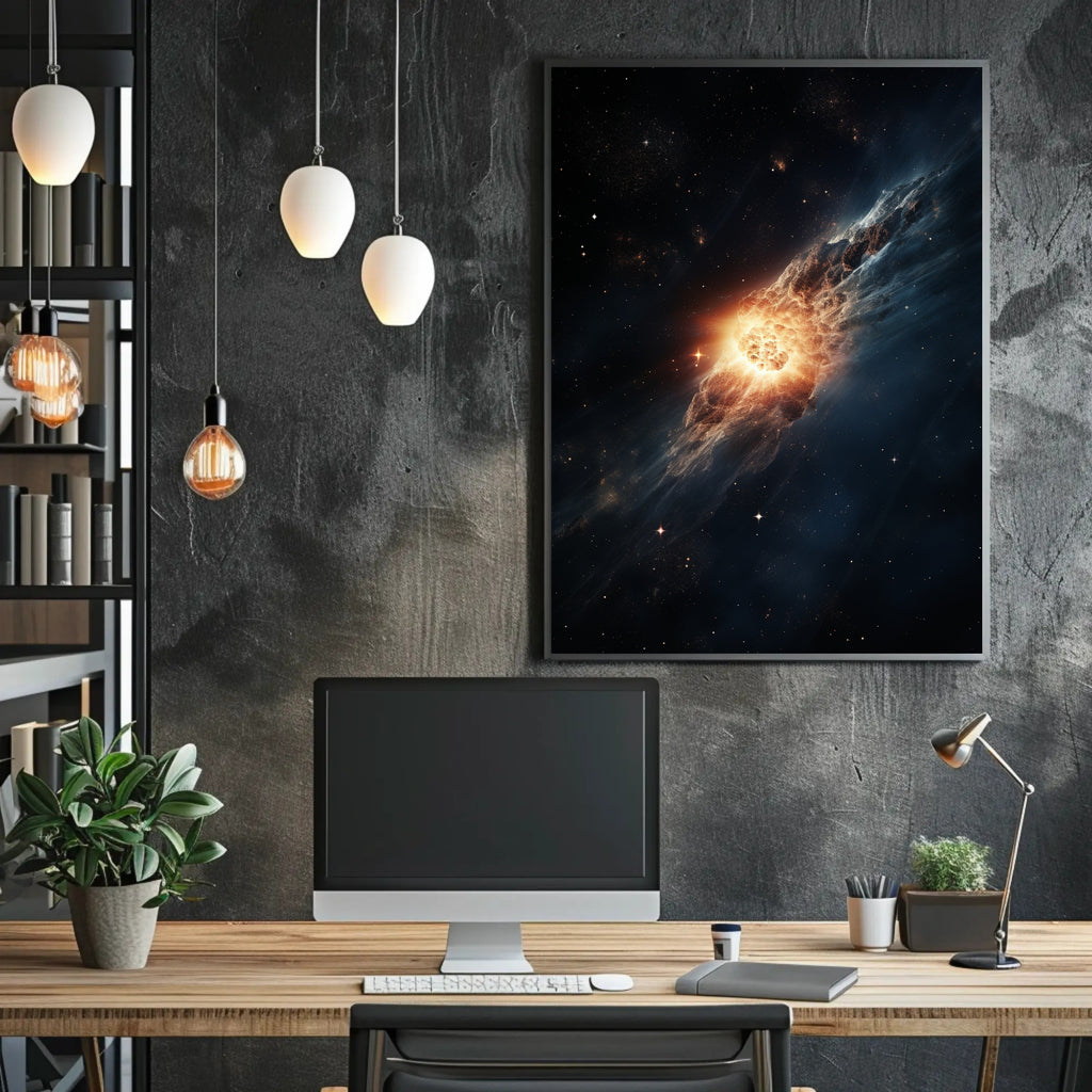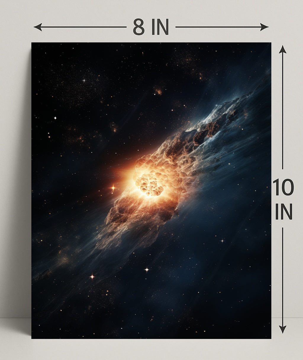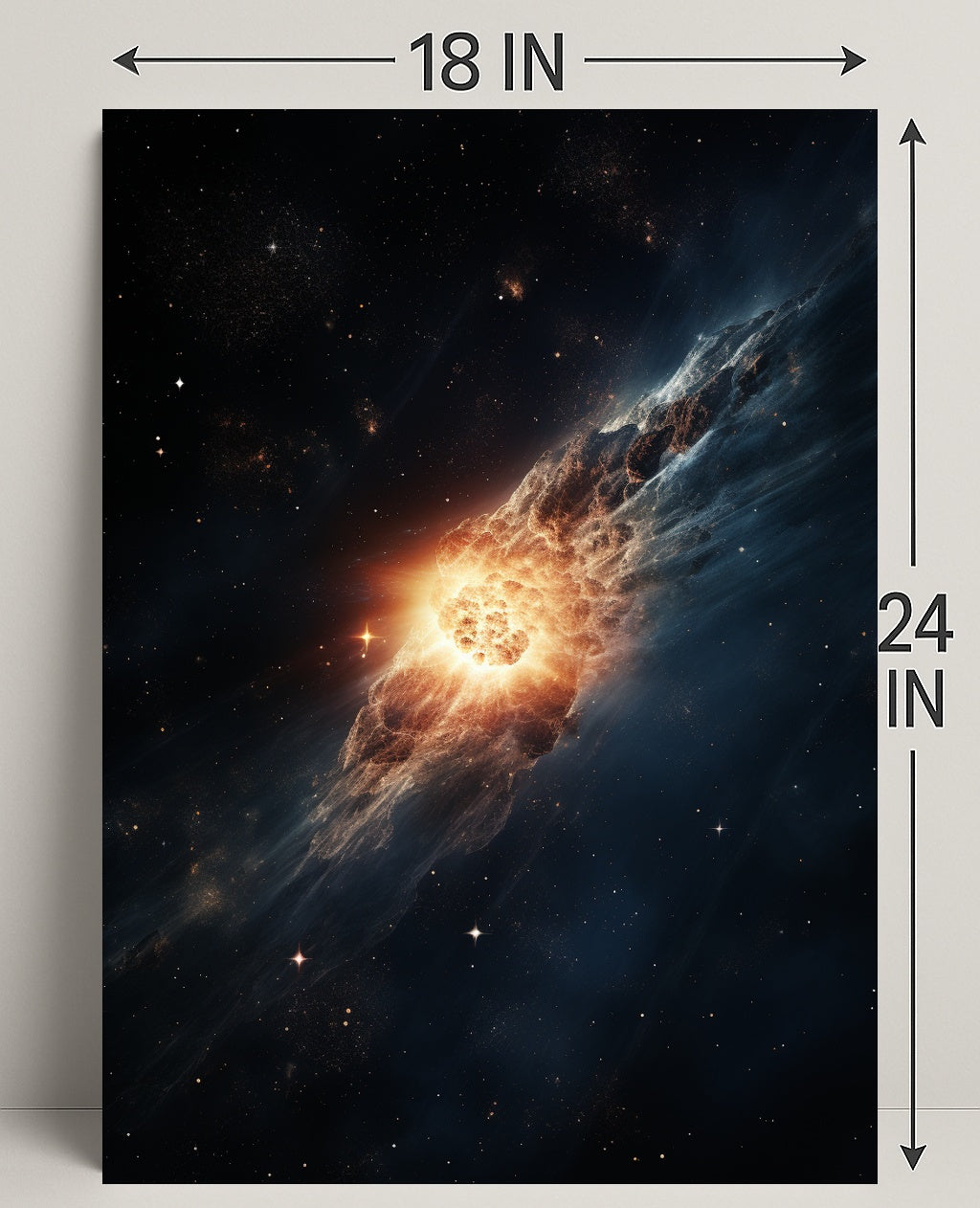 Bring the drama of deep space into your home with the Cosmic Collision Poster from PosterGoat — a striking art print that captures a fiery celestial impact suspended against a field of stars. This high-contrast poster blends vivid orange explosions with cool blue nebula trails to create a dynamic focal point for any room.
