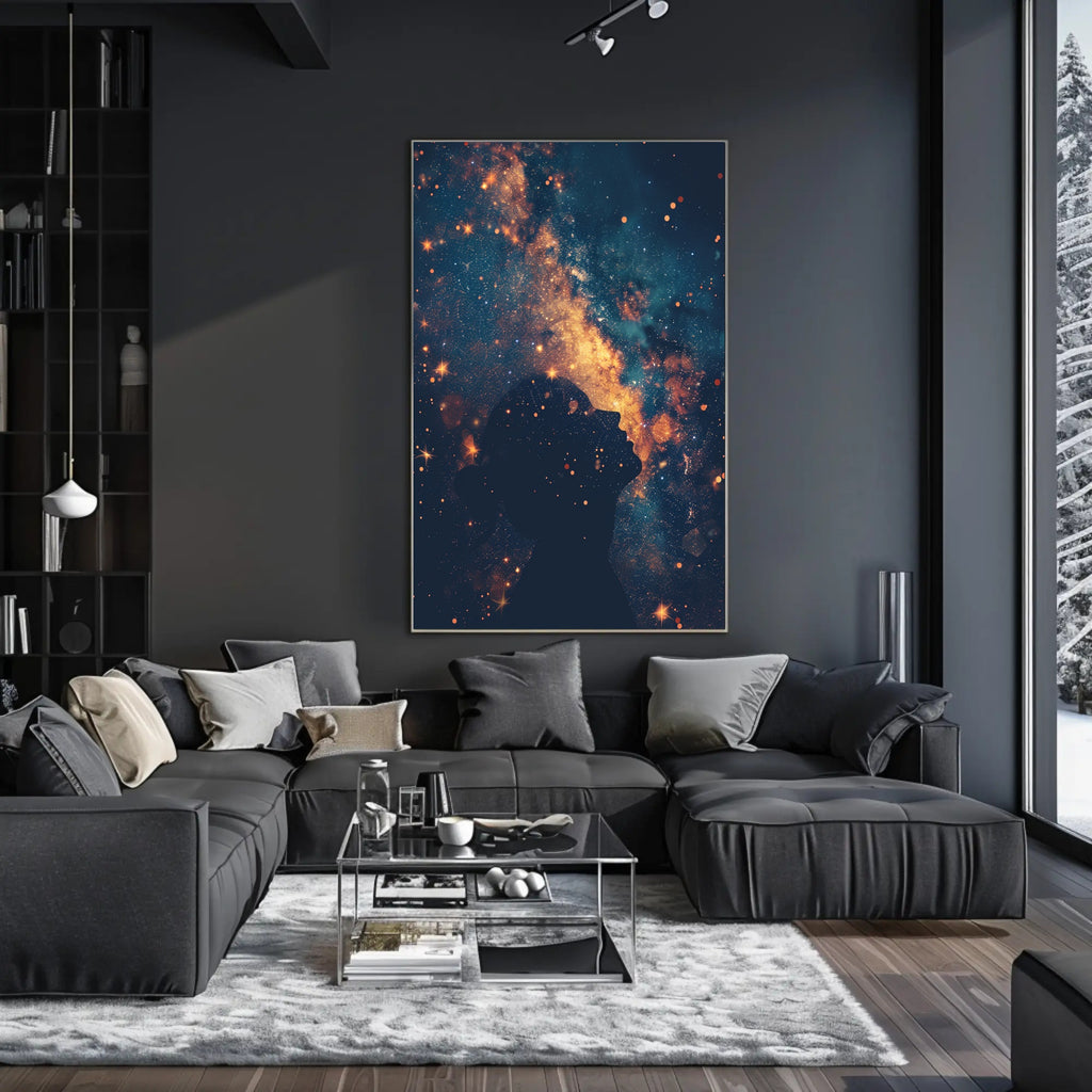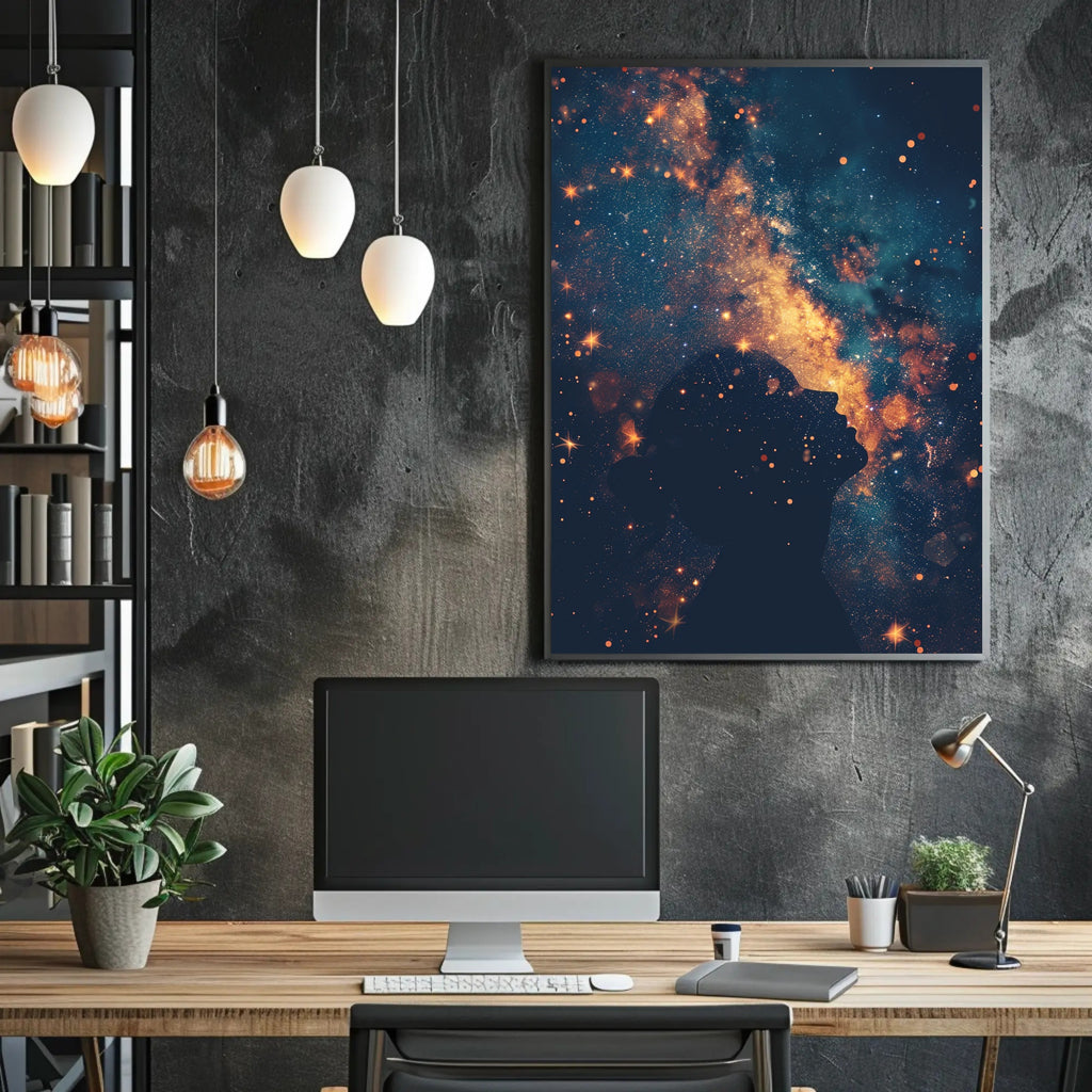 Elevate your interior with the "Cosmic Contemplation" Art Print Poster by PosterGoat — a minimalist yet mesmerizing piece of wall art that fuses scenic cosmic imagery with introspective design. A dark silhouette of a contemplative profile gazes upward into a radiant galaxy: deep navy fields studded with starlight and a luminous, golden nebula that streams like a thought across the sky. This striking contrast of rich indigo and warm amber creates an immediate focal point that suits modern living rooms, bedrooms, offices, or creative spaces.