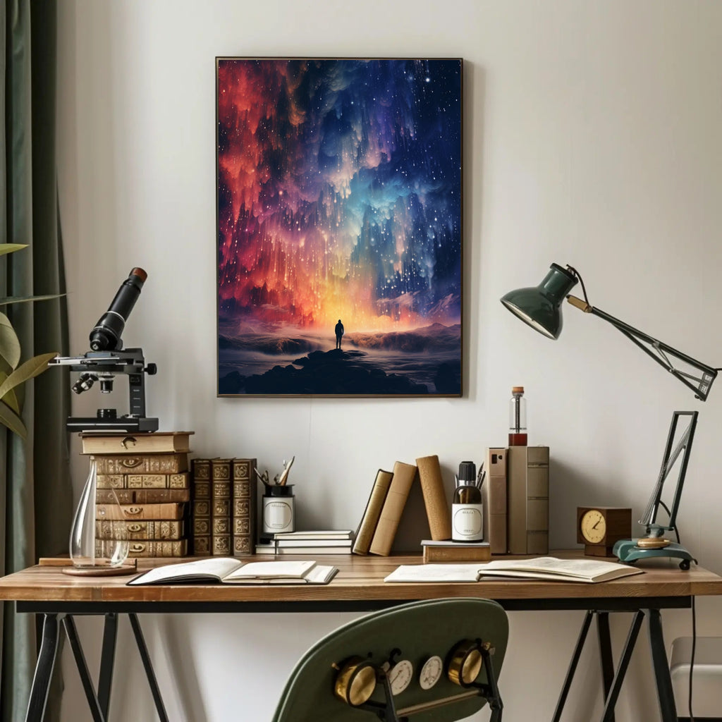 Bring the wonder of the universe into your home with the Cosmic Contemplation Poster by PosterGoat — a striking art print that blends minimalist design with epic, scenic imagination. Vivid streaks of color cascade from a star-filled sky into a glowing horizon while a lone silhouette surveys the scene, creating a powerful focal point that invites reflection and inspiration.