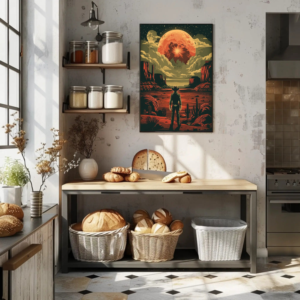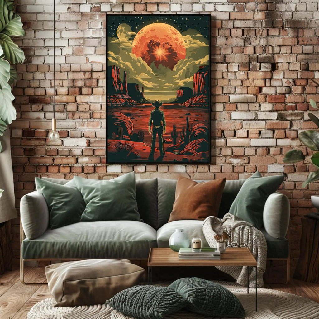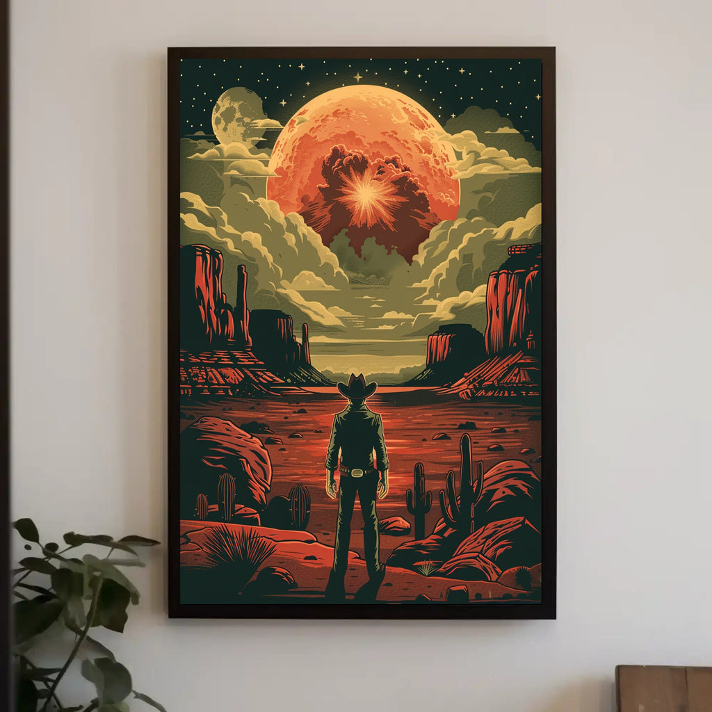 Capture the spirit of adventure with the Cosmic Cowboy Poster by PosterGoat — a bold, pop-art inspired print that fuses western grit with otherworldly wonder. A lone cowboy silhouette stands amid cactus and sandstone mesas beneath a dramatic, blood-orange moon and exploding celestial cloudscape, creating a striking focal point for any room. This poster blends scenic landscape, cosmic elements, and wanderlust energy into one unforgettable piece of wall art.