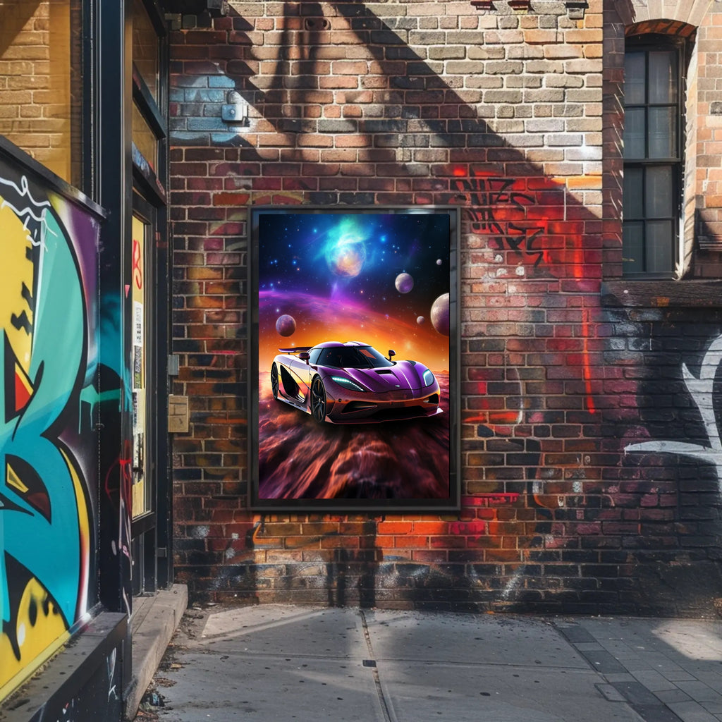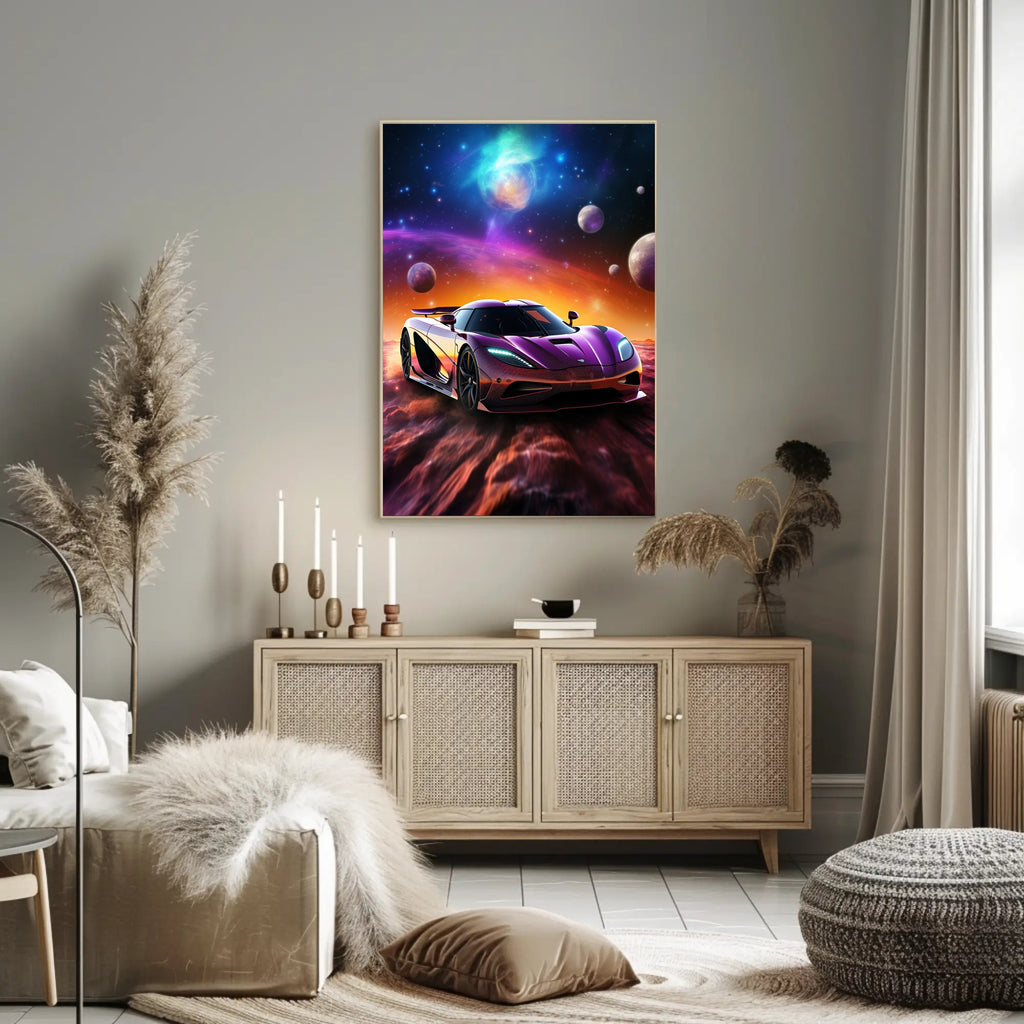 Bring the thrill of a high‑speed journey through the stars into your space with the Cosmic Drive Poster by PosterGoat. This vibrant art print fuses automotive power with otherworldly scenery — a sleek, glossy supercar rendered in rich purples and metallics, racing across a nebula‑lit landscape beneath swirling auroras and distant planets. It’s a statement piece that blends modern Pop Art flair with scenic, cosmic storytelling.