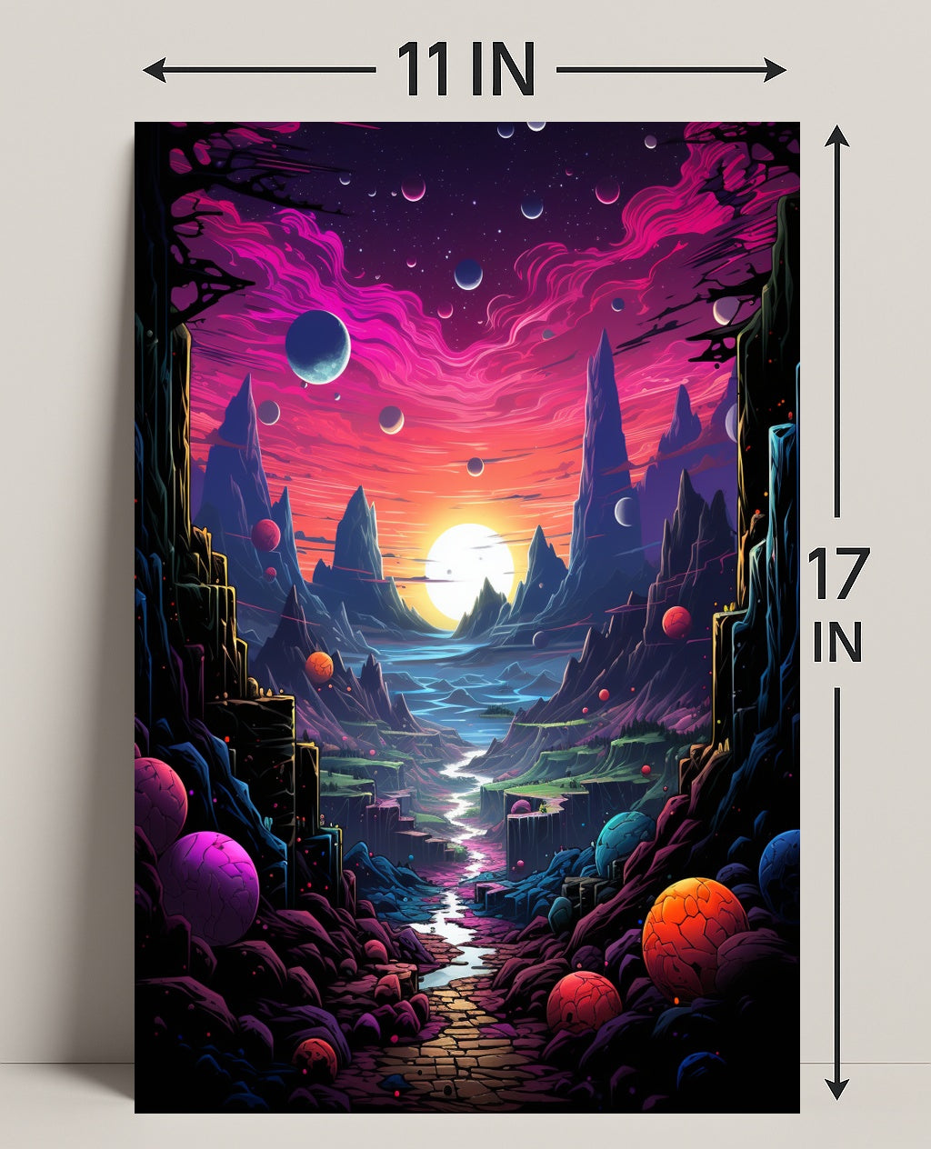 Awaken your walls with the Cosmic Landscape Fantasy Poster from PosterGoat — a vivid, otherworldly print that blends cosmic wonder with dreamlike landscape design. This striking poster features a radiant sun setting between jagged crystal peaks, a winding luminescent river, and scattered spherical orbs that float among swirling magenta clouds and star-strewn skies. Rich contrasts and intense colors create depth and motion, making this piece an instant focal point for any room.