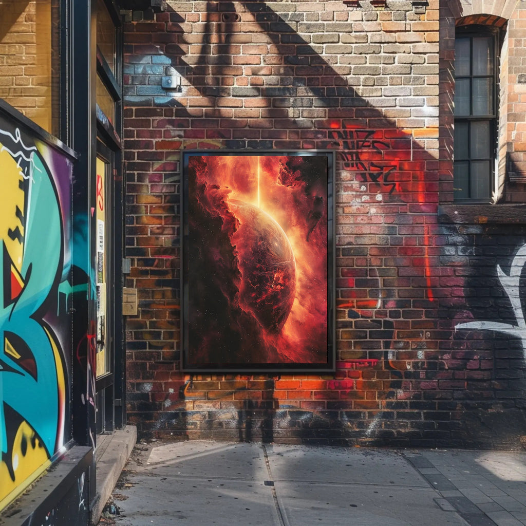 Cosmic Majesty: Fiery Planet in Nebula Poster by PosterGoat transforms any room into a dramatic, otherworldly panorama. This photorealistic poster captures a volcanic planet emerging from a glowing nebula, with dynamic lighting and energy-beam highlights that draw the eye and ignite imagination.