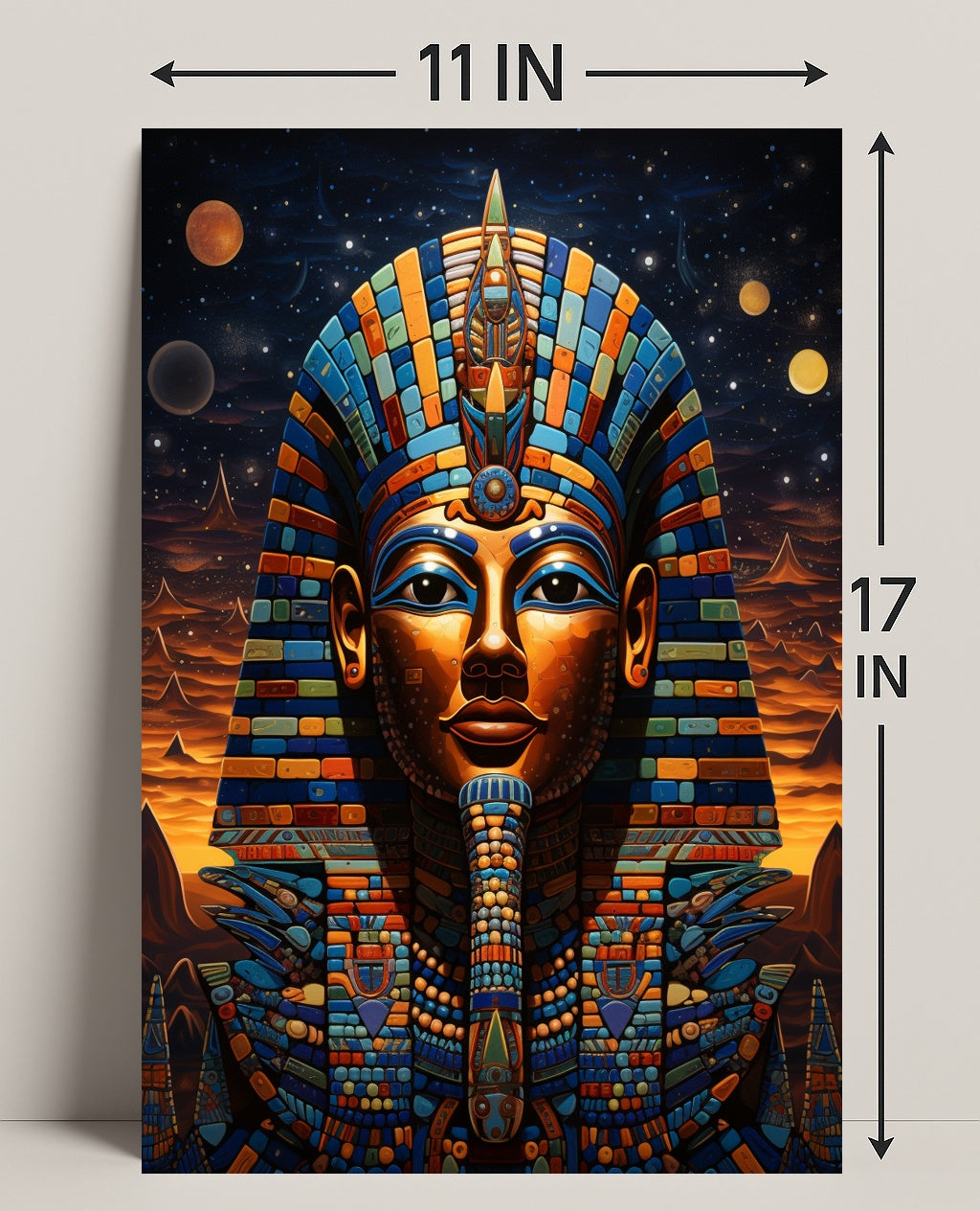 Elevate your home decor with the Cosmic Pharaoh Poster from PosterGoat — a striking fusion of ancient Egyptian grandeur and celestial wonder. This visually arresting wall art features a regal pharaoh rendered in mosaic-like tiles, glowing metallic accents, and a star-studded cosmic backdrop that draws the eye and sparks conversation.