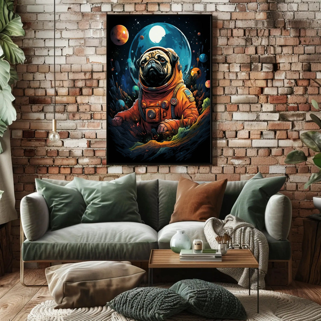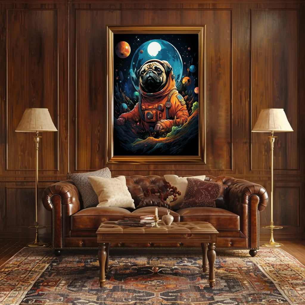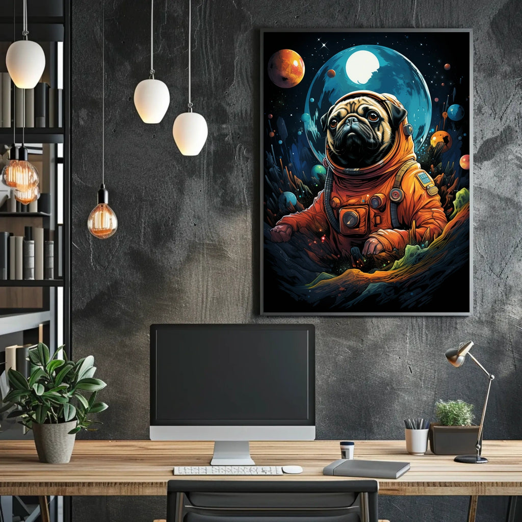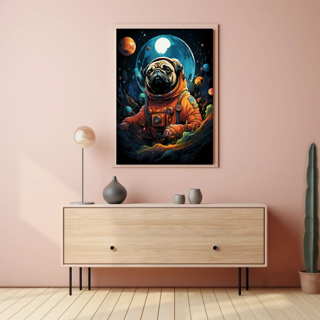 Dive into a whimsical interstellar journey with the Cosmic Pug Adventure Poster. This brave pug astronaut, clad in a vibrant spacesuit, floats across a dreamlike scene of colorful planets and distant galaxies. A playful celebration of curiosity and courage, it adds charm to any wall and sparks conversation among space enthusiasts and dog lovers alike.