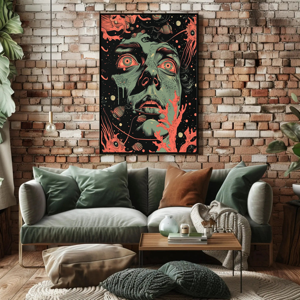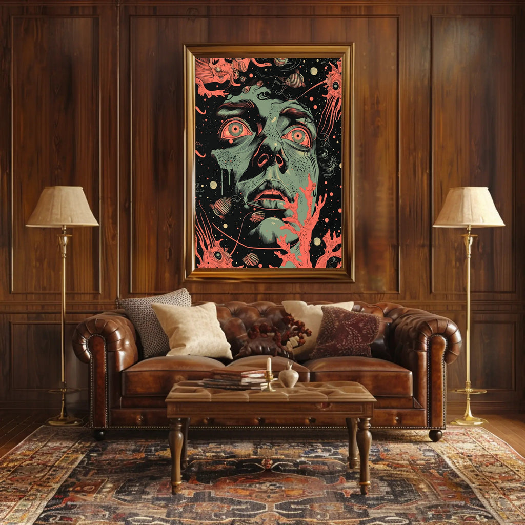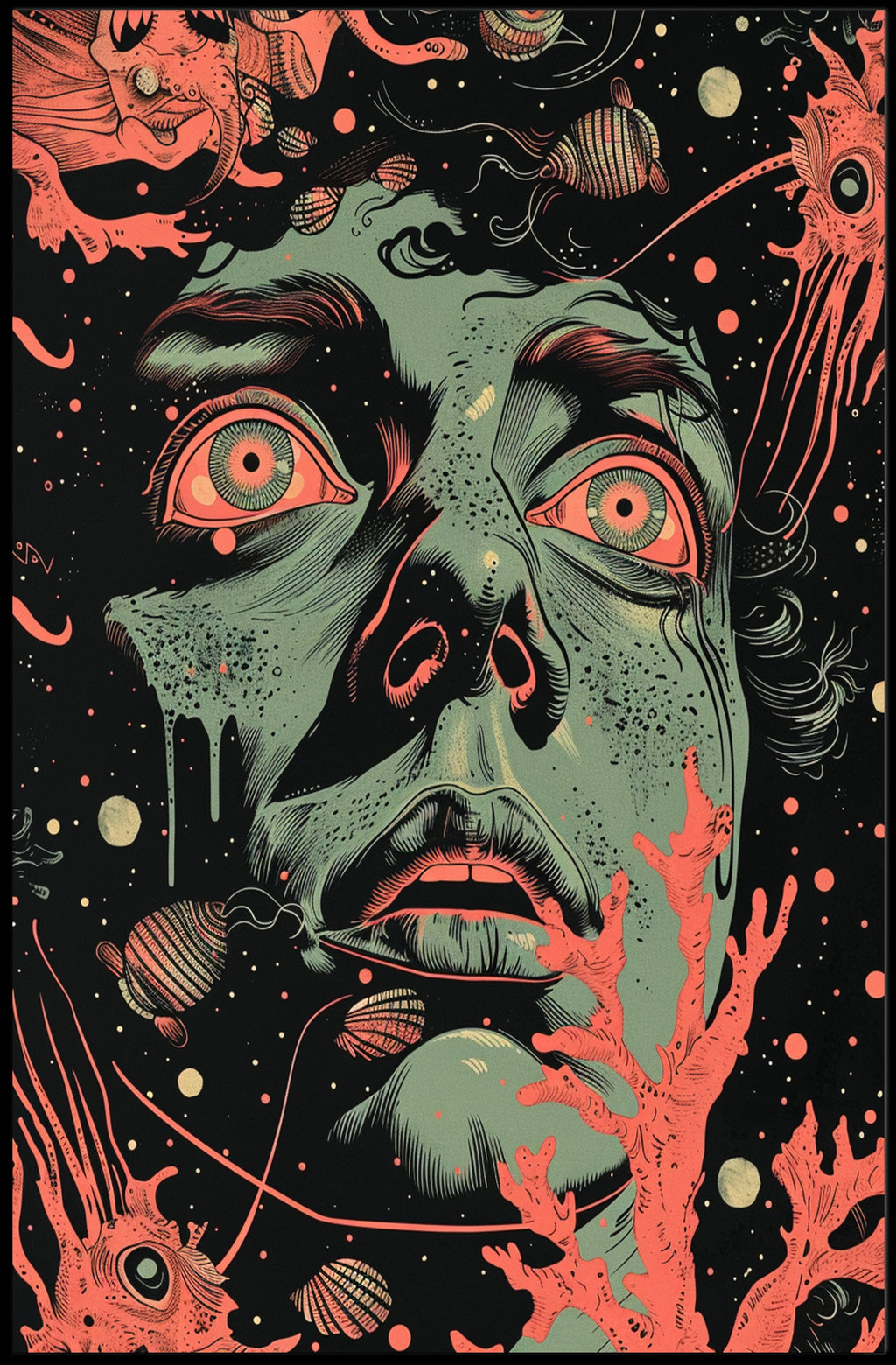 Immerse your walls in otherworldly beauty with the Cosmic Vision Art Print Poster by PosterGoat — a bold, minimalist poster that blends cosmic imagery and scenic wonder into a single, unforgettable statement piece. Featuring a surreal, wide-eyed face emerging from a star-studded black field, coral-like shapes and orbiting shells float around neon coral and mint-green details for a vibrant contrast that draws the eye and sparks wanderlust.