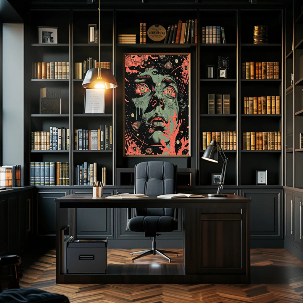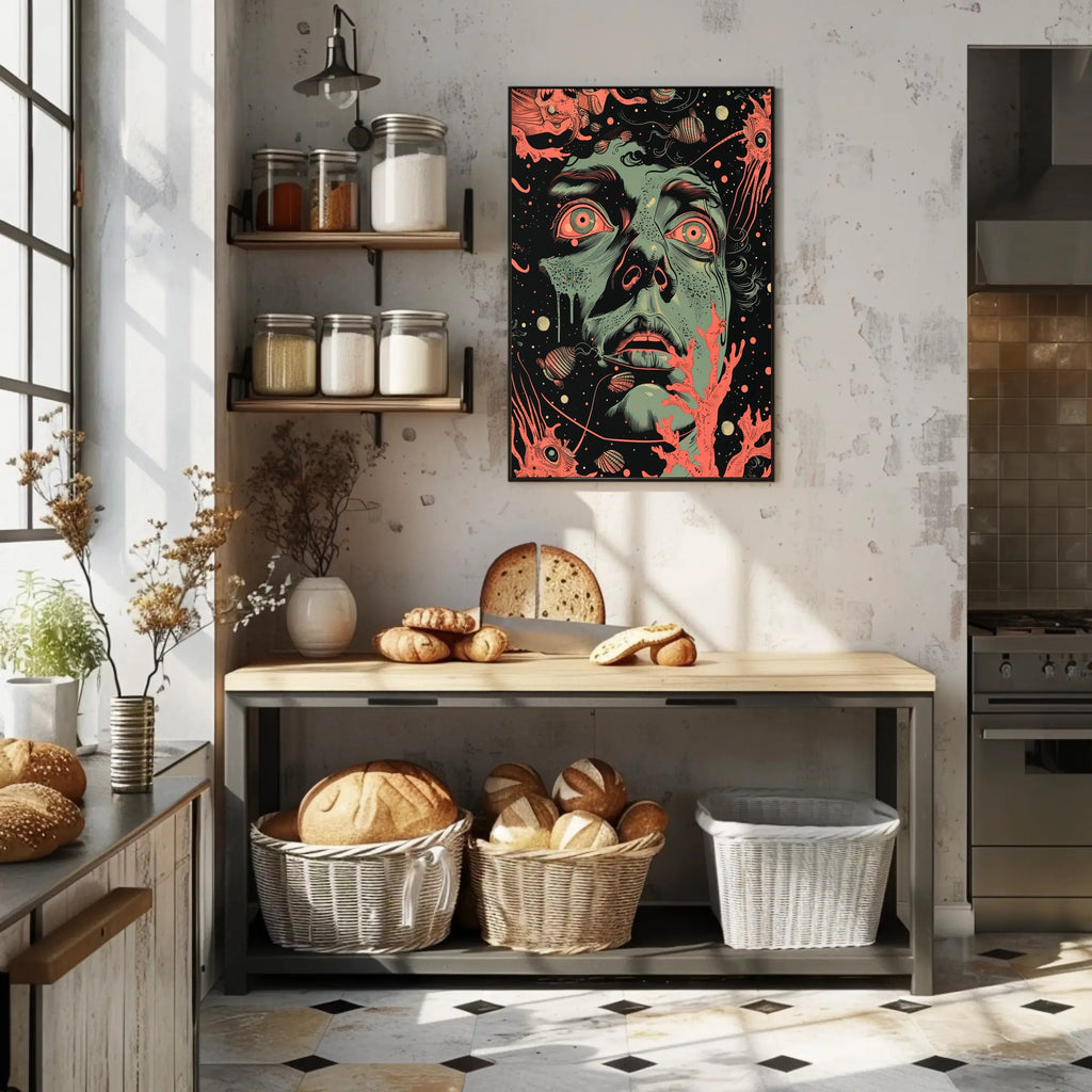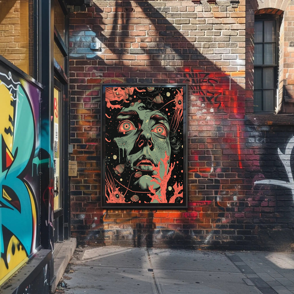 Immerse your walls in otherworldly beauty with the Cosmic Vision Art Print Poster by PosterGoat — a bold, minimalist poster that blends cosmic imagery and scenic wonder into a single, unforgettable statement piece. Featuring a surreal, wide-eyed face emerging from a star-studded black field, coral-like shapes and orbiting shells float around neon coral and mint-green details for a vibrant contrast that draws the eye and sparks wanderlust.