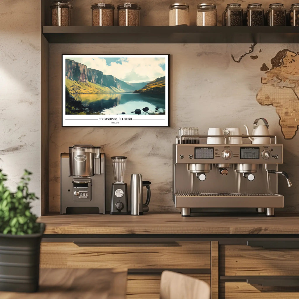 Premium travel poster: Designed as a classic travel poster with elegant white border and understated typography—named “COUMSHINGAUN LOUGH” with “IRELAND” below for authentic wall-art appeal.